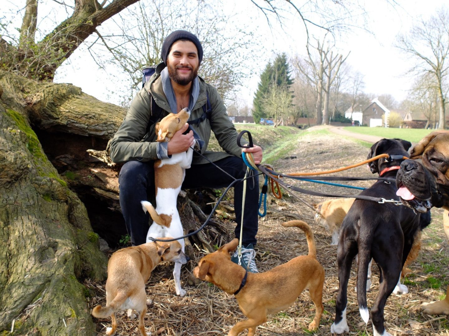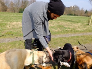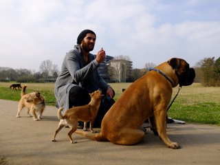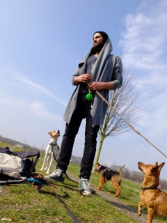 Die Hunde an Masihs Leine sind nicht überfordert. Sie warten auf sein Signal. Und bleiben stehen. Um beim nächsten Signal gemeinsam über die Straße zu gehen. Auf der Freilauffläche, ein paar hundert Meter weiter hinter dem Stüttgenhof, dann immer noch kein Anzeichen von Überforderung. Die typischen Freifläche-Gefahren bleiben aus, keine Spur von Fußgängerschreck oder Fremde-Hunde-Attakierer. Stattdessen schmeißt Masih Leckerchen – und die Hunde warten, bis er ihnen mit einer Handbewegung anzeigt, loszulaufen. Einer der Hunde kommt zu nah an die Bahngleise, ein Pfiff, und der Hund ist zurück an Masihs Seite. Die Hunde haben ihn ganz offensichtlich als Rudelführer anerkannt und zwar alle, wie sie da sind mit ihren unterschiedlichen Rassen und Temperamenten: bei dieser Runde orientieren sich ein Kangal, ein Bull Mastiff, ein Welshterrier und ein Vorstehend-Mix genauso an Masih, wie ein Dackel-Podenco, ein Jack Russel-Chihuahua, ein Boxer und ein Parson Russel. Am Tag zuvor war die Mischung eine andere und ein Tag später kommen noch mal zwei Hunde dazu. Masih Samin ist Hundetrainer und diese Runde ist kein Spaziergang. Diese Runde ist Arbeit. Für den Trainer ebenso wie für die Hunde. Zu ihm kommen sie wegen Verhaltensauffälligkeiten. Sie sind angst-aggressiv, gehen Menschen an, oder andere Hunde. Sie können sich nicht in Gruppen integrieren und ihre Besitzer verzweifeln an ihnen. Angst-aggressiv? Gefährlich? Noch nie habe ich mich so wohl und entspannt unter so vielen Hunden gefühlt. Aber das, so erfahre ich dann, ist das Ergebnis seiner Arbeit mit den Tieren. Dass er allerdings relativ schnell aus einem aggressiven einen ganz entspannten Hund macht, das glaubt man Masih, nachdem man ihn fünf Minuten mit den Hunden erlebt.