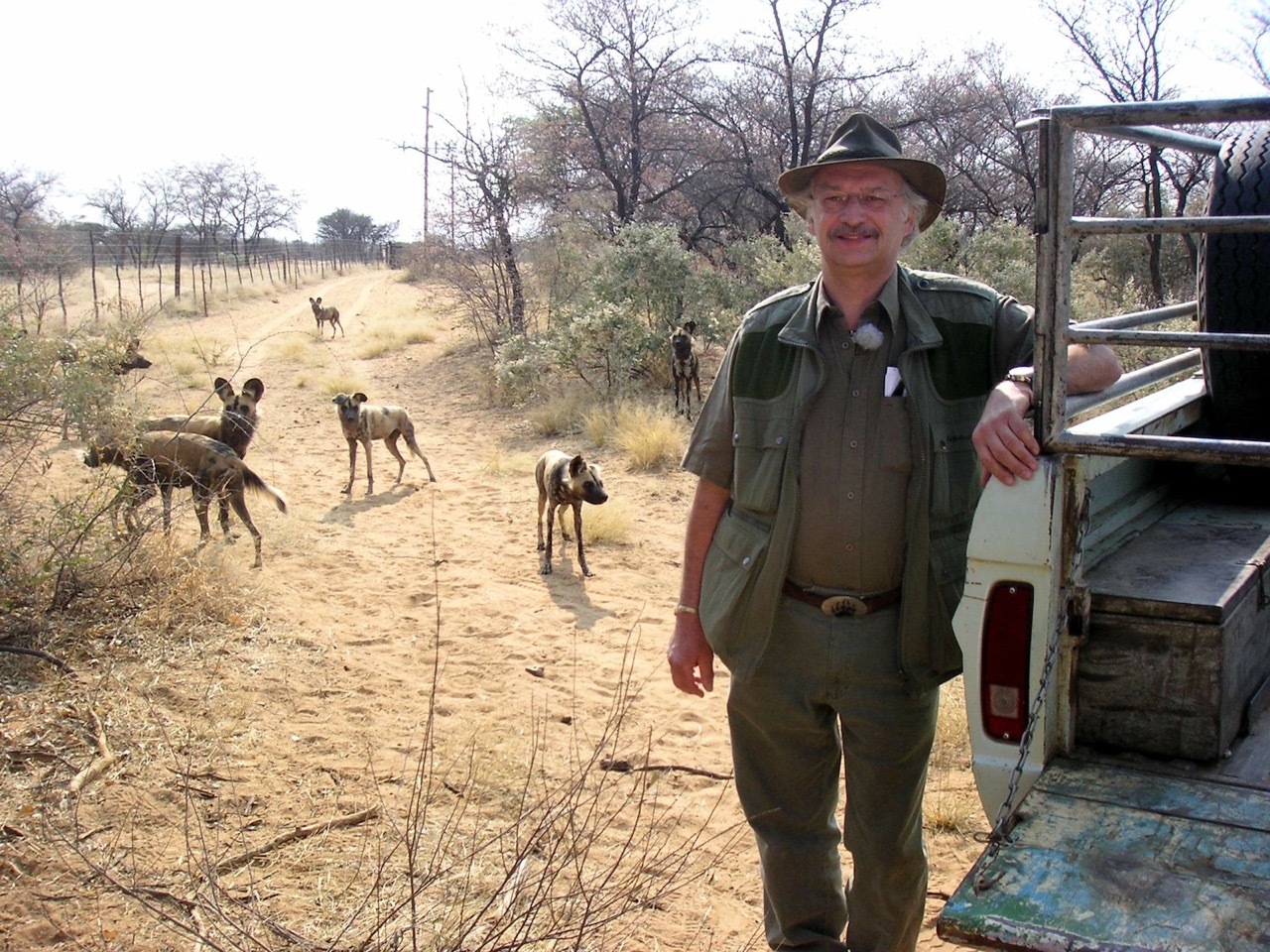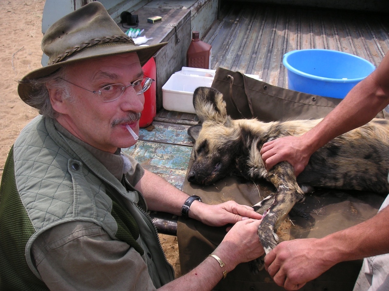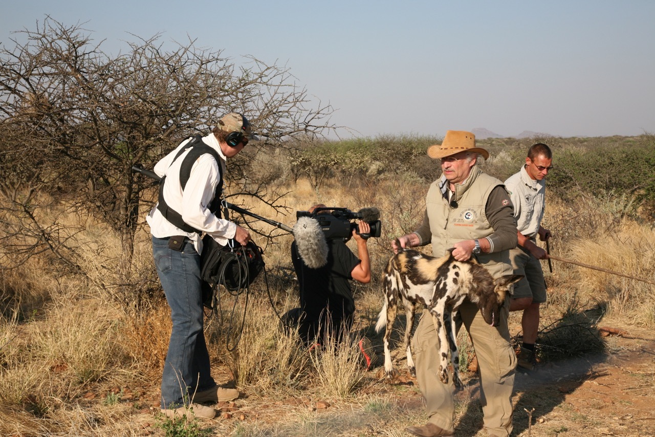Am mehre Quadratkilometer großen Gehege mit einem Elektrozaun angekommen, locken wir die Hunde erst mit Futter an. Mit einem Narkosegewehr werden die Hunde einer nach dem anderen von Ulf betäubt. Wir sind jetzt mit zehn Personen ins Innere des Geheges gegangen und tragen die betäubten Hunde nach draußen zu unserem medizinischen Equipment. Dabei müssen uns die Helfer die wütend ihre Rudelmitglieder verteidigende Hunde mit Stöcken und Ästen vom Leibe halten. Bei jedem Hund wird nach einer gründlichen Untersuchung eine Blutprobe entnommen und dann ein Hormonchip unter die Haut gesetzt. Damit die Hornhaut der Augen, die in Narkose weit offen stehen, nicht austrocknet, bekommen alle eine schützende Salbe in die Augen. Zur Wiedererkennung werden die Farbunterschiede der Schwänze fotografiert. Der Kameramann hat es sichtlich schwer bei den Aktionen den richtigen Sichtwinkel zu bekommen. Aber ich glaube, dass er wunderbare Szenen auf die Kamera bannt, die später auf dem Fernsehsender VOX gezeigt werden. Die fertig behandelten Hunde werden im Gehege in einen Käfig gelegt und mit einer Plane gegen die Sonne geschützt. In den Käfigen bekommen sie dann ein Gegenmittel injeziert, um möglichst schnell wieder aufzuwachen. Als sie alle wach sind, klettere ich auf die Käfige und ziehe die Öffnungen nach oben. Sofort laufen sie etwas wankend ihren Rudelmitgliedern entgegen, die sie fiepend begrüßen und neugierig beschnüffeln. Als alle behandelten Hunde wohlauf sind, sammeln wir unser Equipment wieder ein und fahren zum Haupthaus zurück.