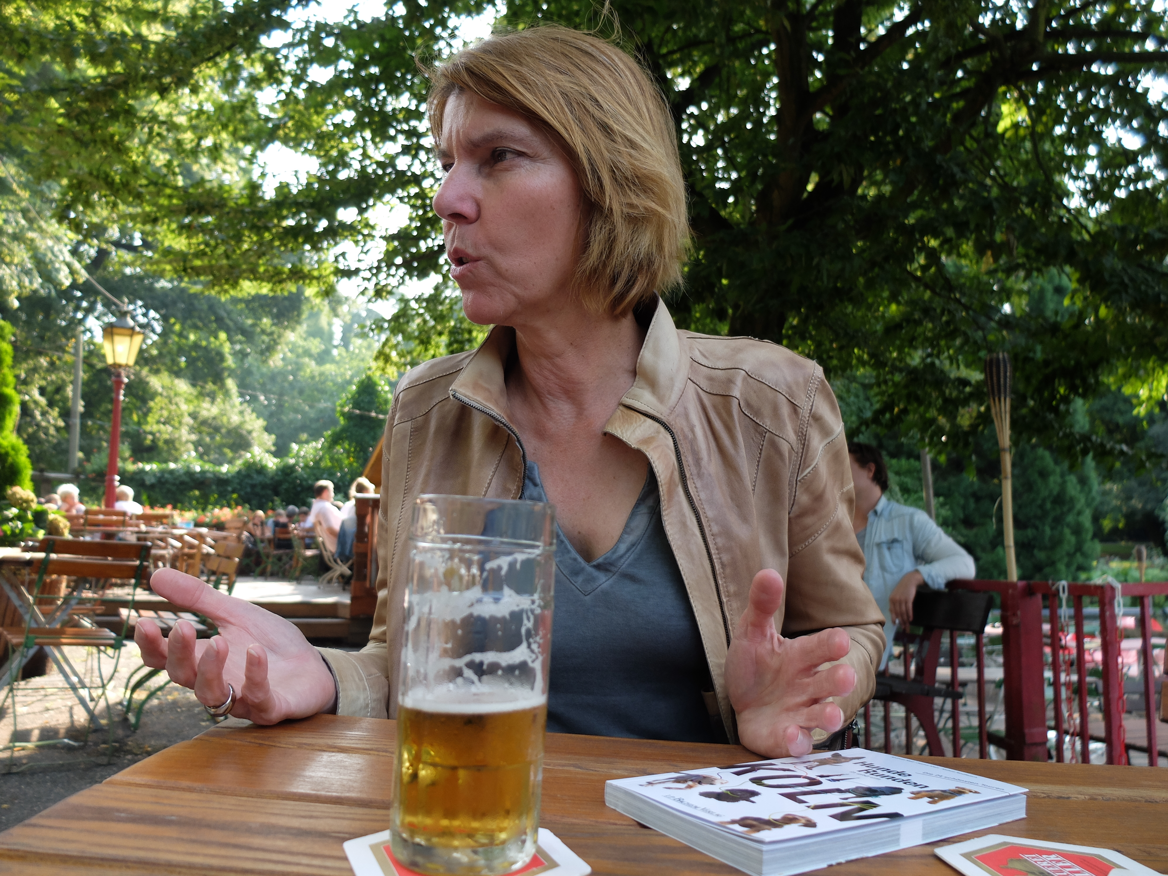 Dackeldame Finchen ist auf dieser Runde immer dann zufrieden, wenn wir in Bewegung sind. Die kurze Pause auf der Wiese und auch das Bier im Anschluss sind für sie ganz offensichtlich unnötige Zwischenstopps, die geräuschvoll zu beenden sind. Wie gut, dass Frauchen Böttinger ihre Sprache versteht. Und sie scheinbar auch spricht: hört Finchen doch genau, wenn Frauchen befiehlt. Bettina Böttinger spricht dackelisch. Hört man ihre Dackel-Historie, scheint das nicht verwunderlich: schon ihre beiden Onkel hatten Dackel. So teilte sie als kleines Kind mit Dackel Ronny den doppelten Hundekuchen von Latz – Momente, die zusammen schweißen. Ein Leben ohne Dackel? Unvorstellbar! Die, wie sie selbst sagt, „frühkindliche Prägung“ sorgt mit der 4-jährigen Finchen nun schon in der 3. Generation für treue Begleitung auf kurzen Beinen. Einen Dackel allerdings hätte ich ihr noch mehr untergejubelt, doch ein trockenes „Die halten ja so lang!“ hilft mir geschickt aus der Fettnäpfchen-Falle. Und so ganz nebenbei spüre ich an meiner eigenen – geretteten – Haut, wieso diese Frau schon so lange erfolgreich talkt: sie gibt Acht. Auf sich, aber vor allem auf ihr Gegenüber.