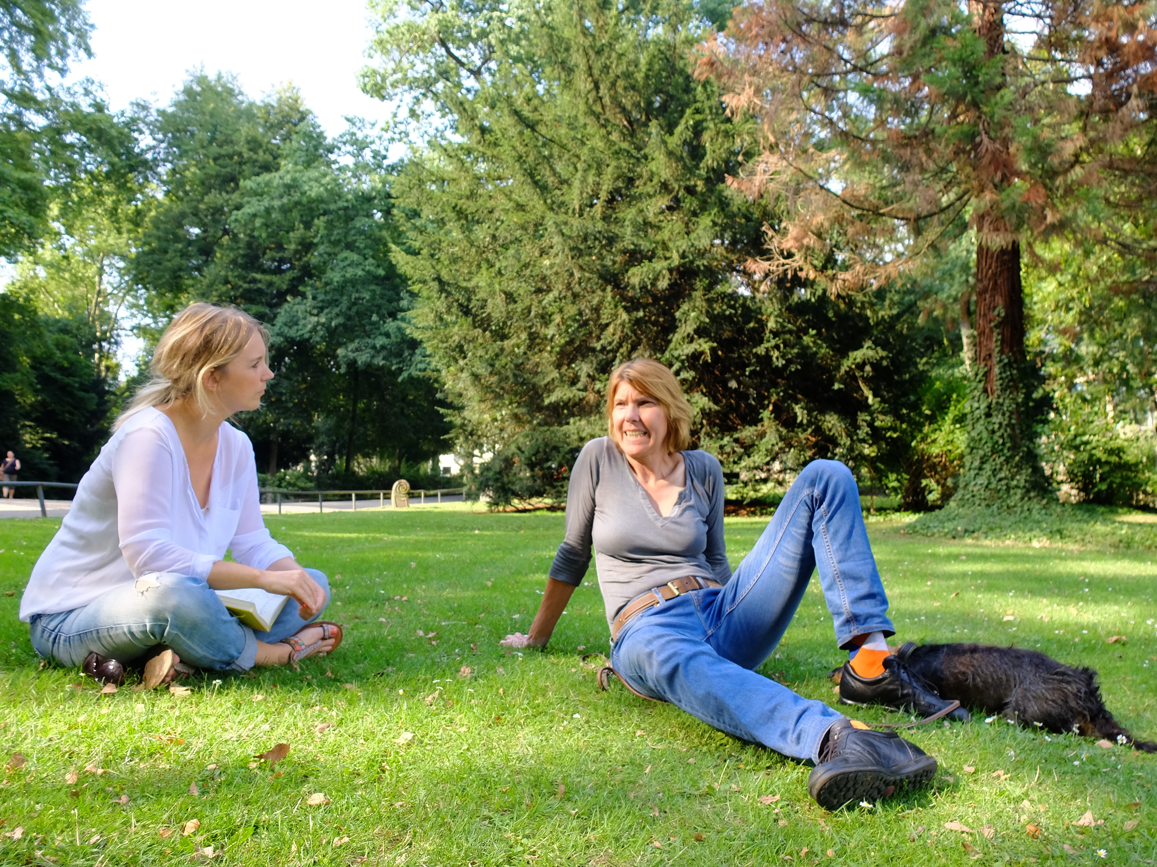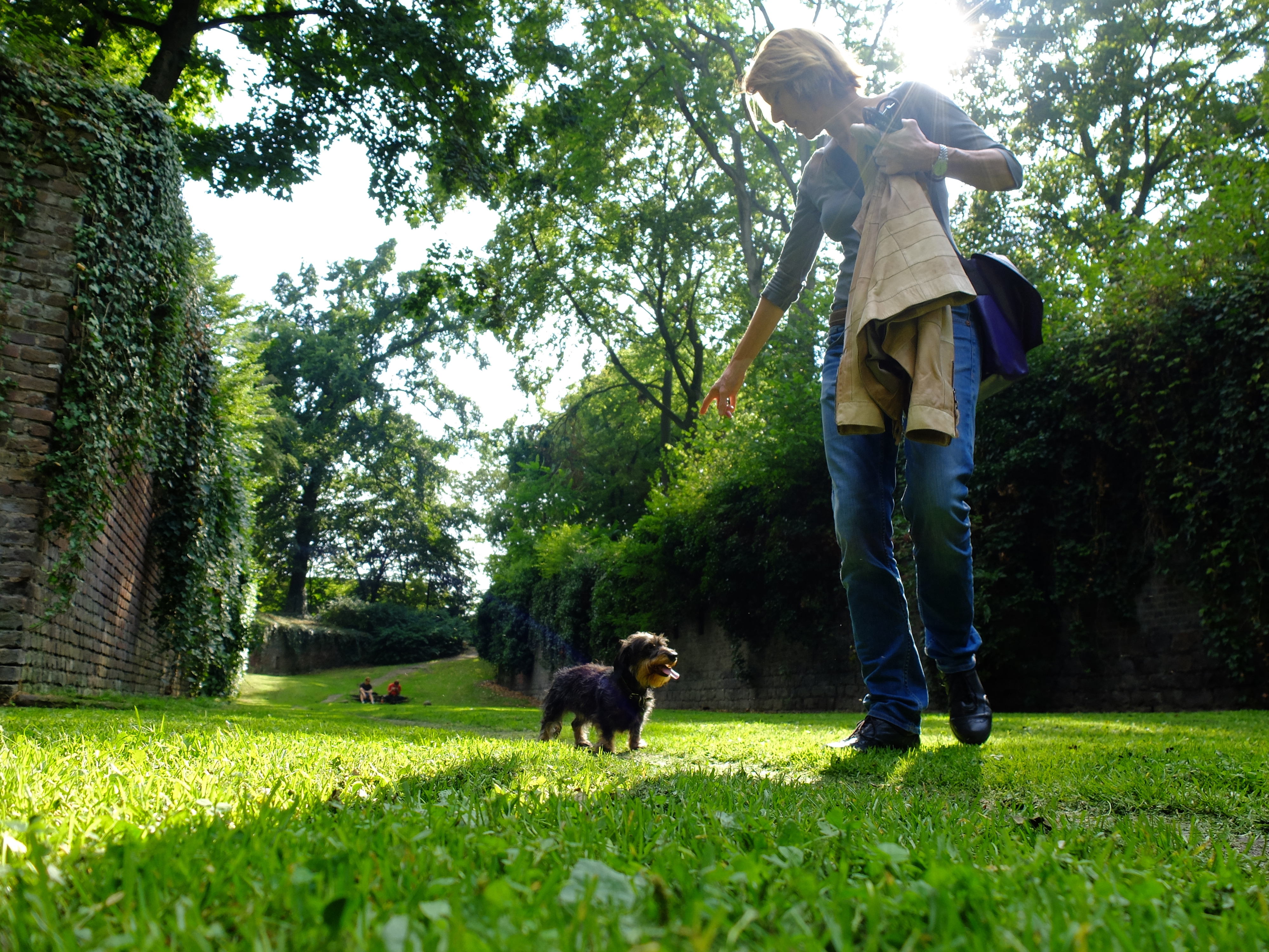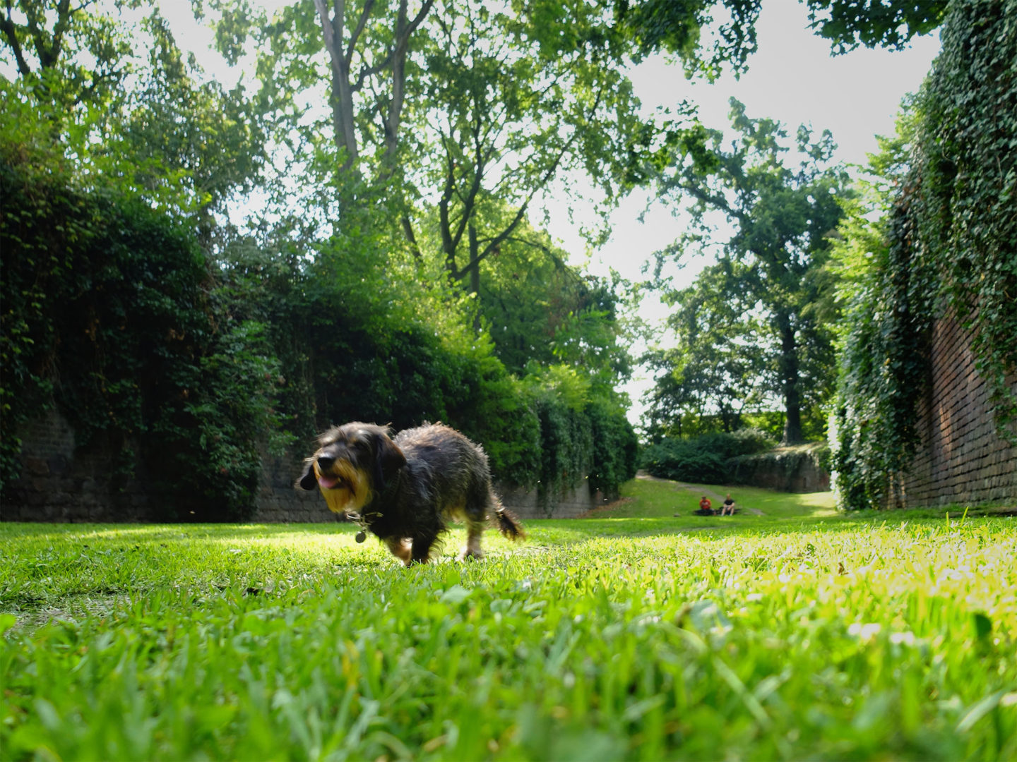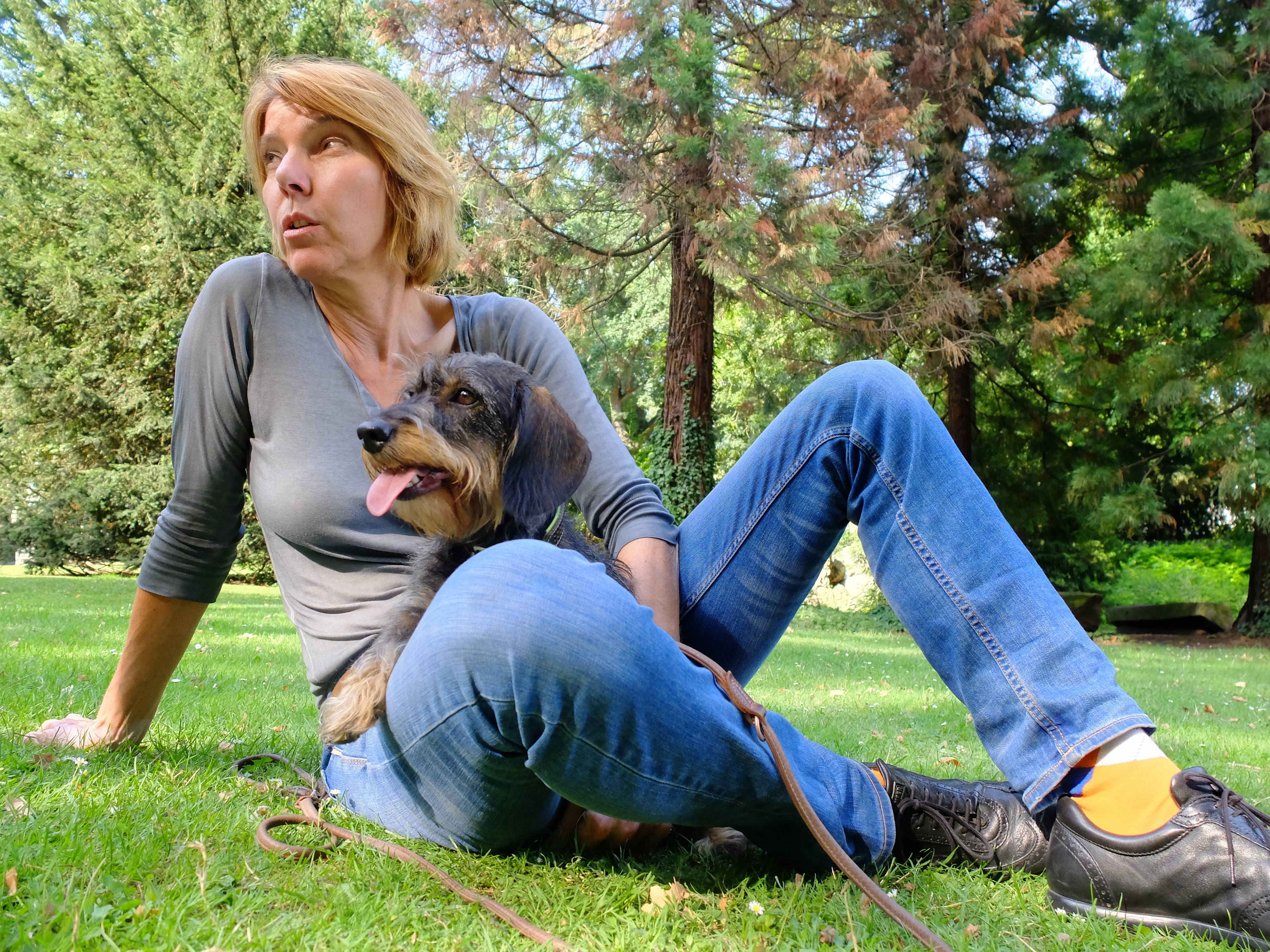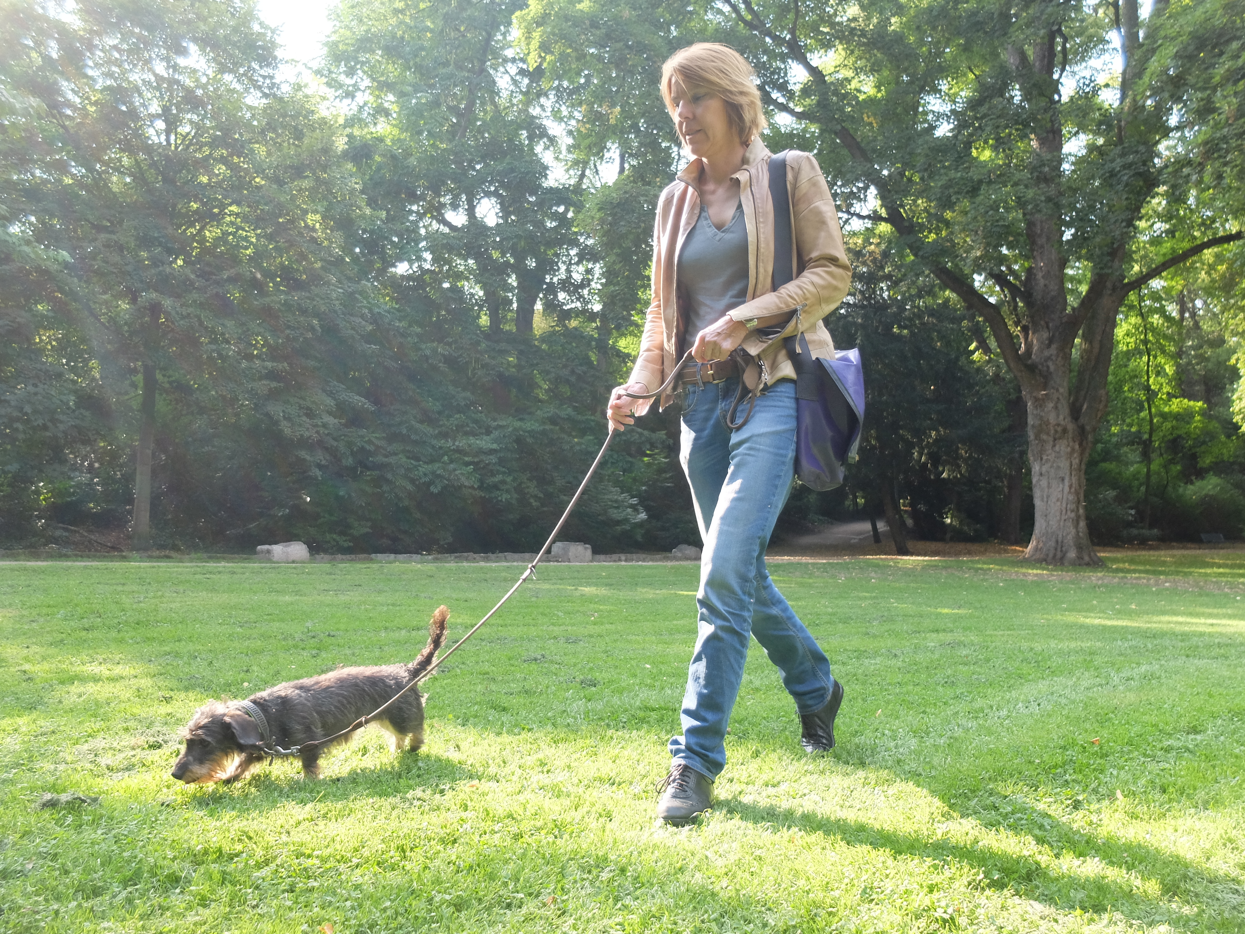 Eigentlich fährt sie lieber Fahrrad, „weil das schneller geht“. Aber heute haben wir Glück: heute geht Bettina Böttinger mit uns zu Fuß. Zusammen mit ihrem Rauhaardackel Finchen gehen wir eine Runde durch den Volksgarten in der Kölner Südstadt. Und gleich zu Beginn müssen wir dann doch ganz schnell sein, auch ohne Rad. Grund sind die „schrecklichen Helikoptereltern“, die Bettina Böttinger die Flucht ergreifen lassen. So flüchten wir von unserem Treffpunkt am Spielplatz in Richtung Rosengarten. Und werden entspannter, mit jedem Schritt ein bisschen mehr. Der unnachahmliche Effekt des Spazierengehens, der beim Menschen genauso einsetzt, wie beim Hund.