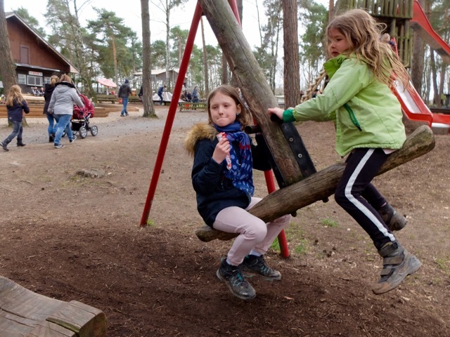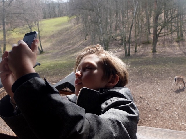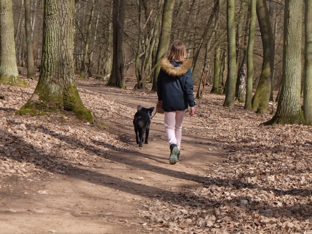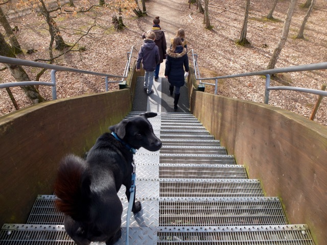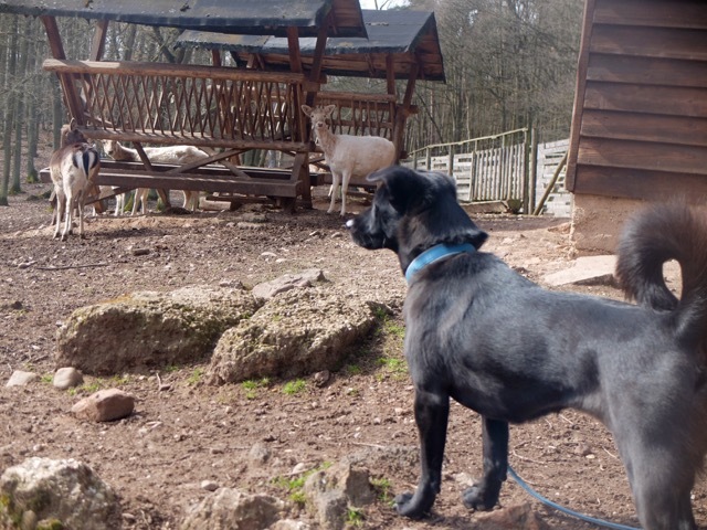 Auch wenn es zu Beginn des Frühlings noch nicht wirklich grün ist, macht der Rundweg Spaß. Kids, Erwachsene und Hund kommen schnell in Kontakt mit einer Handvoll Rehe. Die sind vorsichtig, lassen sich aber gerne füttern - jedoch nur, wenn sich der schwarze, angeleinte Hund in respektvollem Abstand befindet. Peppels ist aufgeregt und hätte sonstwas dafür gegeben, mit dem Paarhufern "Katz' & Maus" zu spielen. Doch ist der Hunderegel Nr. 1, den Vierbeiner stets angeleint zu halten, unbedingt Folge zu leisten.