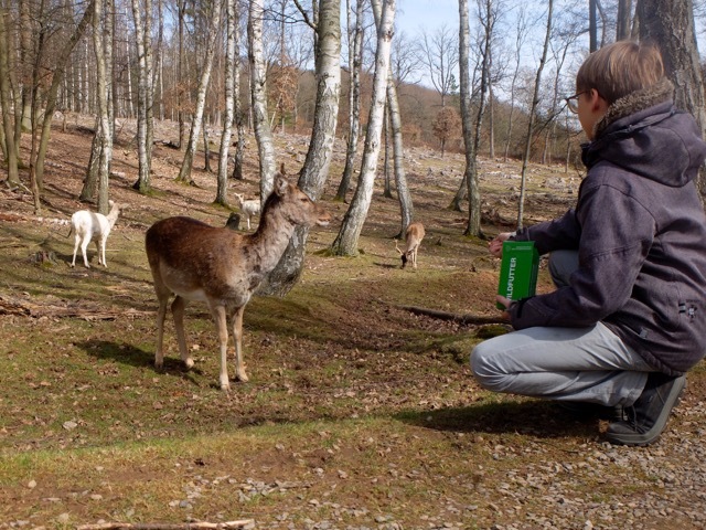 Im nächsten Bereich warten ungarische Steppenrinder, Ziegen, Schafe, Rehe und Hirsche. Die Rehherden veranstalten immer wieder wilde Rennen und scheinen sich dabei über die zahlreichen Besucher zu amüsieren. Für Pepples ist das ein absolutes Abenteuer, bei dem sich der kleine schwarze Hund sehr gerne beteiligt hätte. Ganz im Gegensatz zu den Wildschweinen, die durch einen Zaun getrennt das Erdreich umpflügen, ohne sich aus der Ruhe bringen zu lassen. Der Hund will mit dem Schwarzwild nichts zu tun haben - die Kids hingegen begeben sich direkt ins Gehege. Es ist tatsächlich total spannend, wenn eine Bache (Wildsau) mit ihrem Nachwuchs (Ferkel) in nur zehn Metern Entfernung vorbeizieht. Hunde haben hier keinen Zugang und müssen draußen warten - für meinen Hund war das übrigens kein Problem. Für diesen Rundgang durch den Wildpark gibt es eine GPS-Audiotour mit persönlichen Erklärungen von Wildpfleger Etienne und Lauschtour-Reporter Marco. An insgesamt 18 Lauschpunkten warten Informationen und spannende Geschichten zu den Tieren (APP kostenfei herunterlagen).