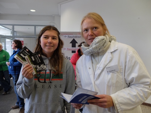 Die Tierärztin nimmt im Laufe der Messe ca. 250 Hunde unter die Lupe. Der Gesundheits-Check bei Pepples ergibt, dass das Fell glänzend, die Haut glatt, der Zustand der Augen und der Zähne sehr gut ist und es auch ansonsten nichts zu beanstanden gibt. Jedoch sagt die Tierärztin, dass es dem Hund gut täte, wenn er ein halbes Kilogramm abnehmen würde. "Zu viele Leckerchen", weiß Jule Moll sofort. Nun soll die Kölnerin ein Protokoll erstellen und alles aufschreiben, was der Hund an einem Tag frisst. Die Tierärztin bietet an, den täglichen Nahrungsbedarf zu berechnen, und dann für eine gewisse Zeit die reduzierte Menge festzulegen. Ende des Jahres soll Jules Hund dann 16,5 Kilogramm wiegen.