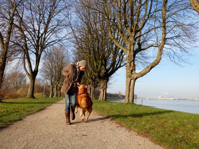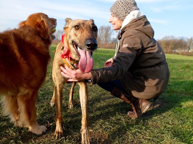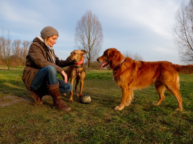 An ihrem freien Mittwochnachmittag genießt sie die einzigen Sonnenstrahlen der letzten Tage in der Neußer Rheinaue - ganz in der Nähe des Sporthafens, der an diesen Tagen sehr unter dem Hochwasser leidet. Sabine Hulsebosch ist mit ihren beiden Hunden unterwegs: Jasper und Kleo. Jasper, ein reinrassiger Golden Retriever, hat sie vor knapp sechs Jahren vom Züchter gekauft und als Welpen zu sich genommen. "Jasper muss ich immer beschäftigen, denn er stammt aus der sogenannten Arbeitslinie dieser Rasse, "über die viel zu wenig bekannt ist" sagt die Hundefachfrau, "und das verpflichtet mich als Besitzerin!" Während der gesamten Hunderunde "arbeitet" sie mit Jasper, legt Fährten, schmeißt Dummies ins Wasser und versteckt ihren Schlüsselbund, den Jasper dann auf Kommando holen darf. Und Jasper ist mit seinem Job absolut zufrieden. Kleo jedoch, ein Podenco-Galgo-Mix, ist das gesamte Gegenteil. Die Hündin hatte es der Trainerin angetan, als sie für die "Superhund-Serie" in deutschen Tierheimen auf Casting-Tour war. Obwohl sie, wie sie sagte, in dieser Phase absolut keine Zeit für eine neue Aufgabe hatte - und vor allem nicht für das zu dieser Zeit völlig verängstigte Weibchen. Aber erstens kommt es anders, zweitens als man denkt und drittens hatte sich der Hundecoach einfach in Kleo verliebt. So ist das eben. Für die Serie hätte Kleo von ihrer Empathie und ihrer Klugheit her schon gepasst, jedoch ist der Jagdtrieb für eine Partnerschaft mit einem gehandicapten Menschen absolut nicht geeignet. Sabine Hulsebosch ermöglicht Kleo nun ein Leben, wofür sie gemacht wurde: Laufen, laufen, laufen und kontrolliert jagen dürfen. Natürlich ist die tägliche (Erziehungs-) Arbeit mit dem Podenco-Galgo-Mix überaus wichtig.