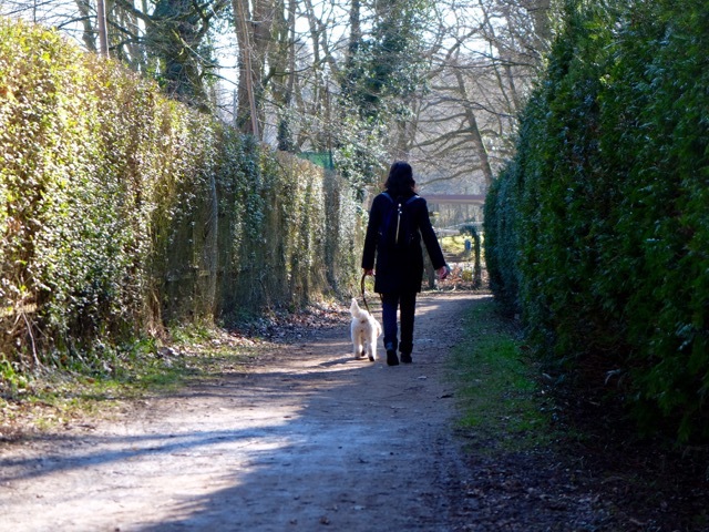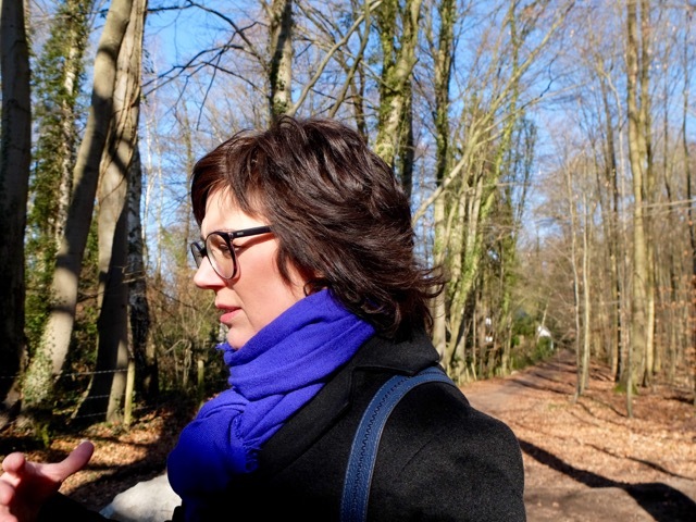 Eigentlich ist die Hundehalterin keine Freundin von Waldspaziergängen, sondern genießt eher abendliche Hunderunden in Hamburger Wohngebieten. "Ich finde es toll, mir schöne Häuser anzuschauen und wage dann auch den ein oder anderen Blick in die hell erleuchteten Wohnzimmer." In ihrer Geburtsstadt Aachen wählt sie eine sehr abwechslungsreiche Hunderunde im Süden der Stadt aus. Beginnend an einem kleinen, an diesem Tag zugefrorenen Stausee Kupferbach, führt der Weg durch den Aachener Wald um das Waldstadion herum. Hier sind Fußballspieler und Leichtathleten zu Hause und jagen dem runden Leder, bzw. Rekorden hinterher. Darüber hinaus bot das Stadion auch eine besondere Kulisse für ein Konzert des Startenors Placido Domingo im Jahr 1990. Nach einem kleinen Abstecher in die angrenzende Wohnsiedlung, in der einmal ihre Jugendliebe gewohnt hat, geht es über den Philosophenweg zurück zum Ausgangspunkt der mittäglichen Hunderunde. Besonders auf diesem letzten Teil des Weges schien sich die Autorin, die über sich selbst sagt, sie sei keine Freundin des Tiefgangs, sehr wohl zu fühlen.