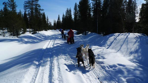 Im sogenannten „Frühlingswinter“ sind die Tage nördlich vom Polarkreis schon deutlich länger als in Mitteleuropa. Direkt hinter dem Hundecamp geht es los. Unsere Gespanne stehen hintereinander und schon beim losfahren merkt man, warum jeder Schlitten drei verschiedene Bremsen hat. Die Hunde sind kaum zu halten, sie wissen, dass es gleich losgeht und machen einen Irrsinnslärm. Dieser Gesang ist das, was am deutlichsten in Erinnerung bleibt: er ist eindringlich, sehr ursprünglich und unverwechselbar.