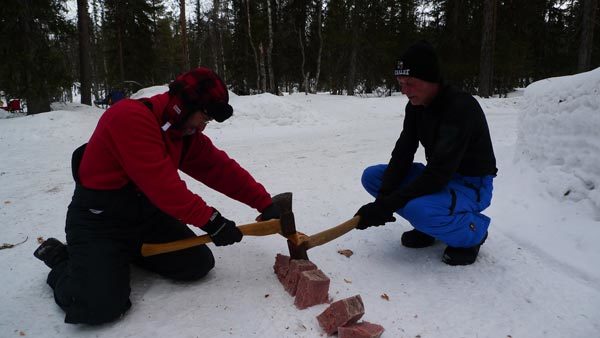 Jeden Abend kommen wir an eine Hütte und sind schon rechtschaffen fertig. Noch ist das Tagwerk nicht getan: Die Hunde kommen an eine lange Kette. Nicht, weil sie weglaufen, aber damit es nachts keine Rangordnungsrangeleien gibt. Jeder bekommt eine Kelle Trockenfutter. Wir laden ab, hacken ein Loch in den See, schmelzen Wasser. Einer geht mit der Schippe auf den Lagerplatz der Hunde und beseitigt den gefrorenen Kot der Vorgruppenhunde. Zwei andere hacken das gefrorene Fleisch in handliche Stücke. Und die restlichen machen herzhafte Eintöpfe für die Menschen. Es gibt einen klaren Ablauf: Eine Stunde nach dem Trockenfutter bekommen die Hunde Wasser, werden auf Verletzungen untersucht und begutachtet, eine weitere Stunde später bekommt jeder sein gefrorenes Stück Fleisch. Es sind erstaunliche Tiere. Eine Schippe Trockenfutter, ein Stück Fleisch und sie rennen den ganzen Tag. Allein von der Ernährung würden unsere Stadthunde krank, hier ist das Team topfit. Wenn wir morgens zu ihnen kommen, hat sich jeder eine kleine Kuhle in den Schnee geschmolzen.