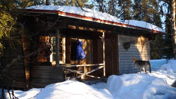 Wir Menschen sitzen erschöpft und satt in der Abendsonne vor unserer Hütte. Meist gibt es eine Sauna, die einer anwirft. Wir lernen schnell, Wasser mit dorthin zu nehmen, um uns zu waschen: Dort ist es warm. Das WC wird zum TC (Trockenklosett) in einer extra Hütte und nachts stapfen wir mit Schneehose und Stiefeln dorthin. Luxus ist anders. Und es ist dennoch der größte Luxus. Wir sind mitten in der Natur, es ist still, der Musher pennt sogar manchmal draußen bei seinen Hunden, weil er keine Lust hat auf den Raum, in dem wir alle schlafen. Man kommt sehr zu sich und zur Ruhe. Und dann sprinten wir alle raus – ein Nordlicht! Die grünen Bänder breiten sich wellenartig über den Himmel, in echt viel zarter als auf den vielen Fotos, die wir gesehen haben.