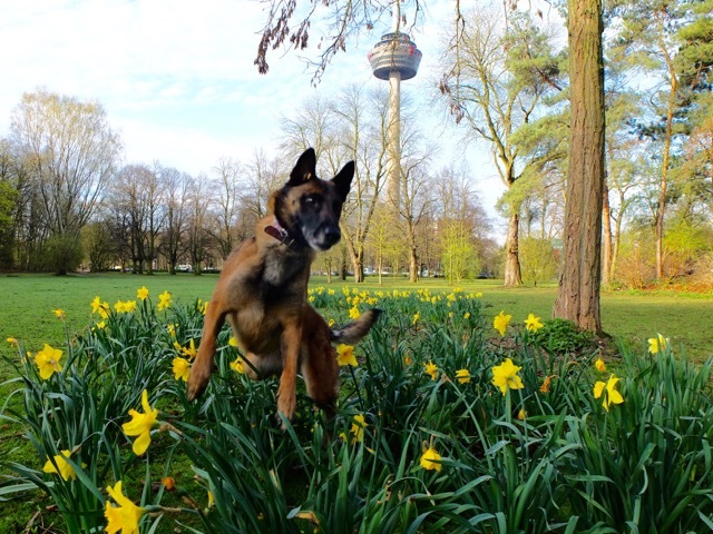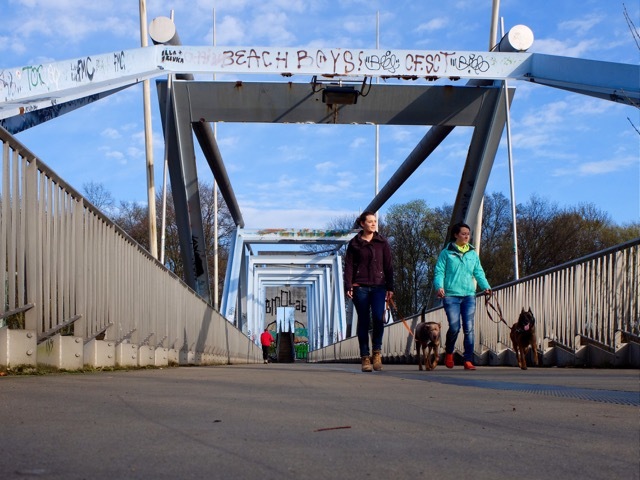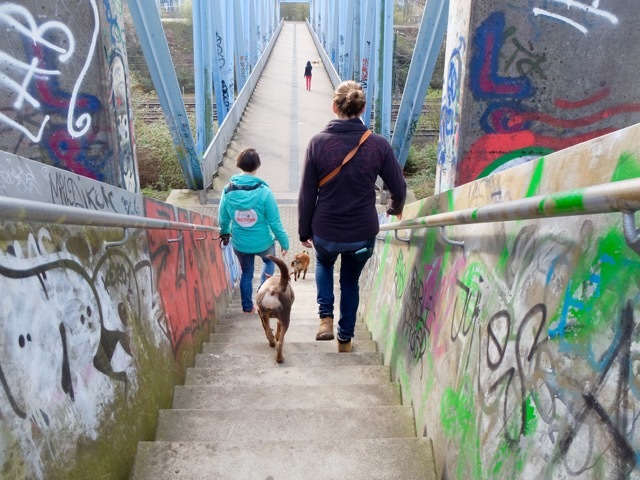 Nachdem die Brücke zum "Mont Klamott", wie die Kölner den Herkulesberg nennen, überschritten ist, können die Vierbeiner endlich frei laufen. Kara Erz und Jennifer Käferböck hatten sich genau hier vor gut sieben Jahren kennengelernt, gingen regelmäßig auf die Hunderunden, merkten dabei, dass die ganz ähnlich tickten und wurden schließlich enge Freundinnen. "Kara war es auch, die mich zum Frisbee-Sport gebracht hat", sagt die 32-jährige gebürtige Kölnerin. Beim ersten Treffen wurde sie von der Hundetrainerin ermahnt, ihrem Hund wegen des hohen Verletzungsrisikos keine Stöckchen zu schmeißen und auch das stupide „Bällchen spielen“ sein zu lassen. Sie brachte ihr (und ihrem Hund) die sehr abwechslungsreiche Sportart Dogfrisbee nahe, die für Mensch und Hund eine interessante Ergänzung zum Alltagsspaziergang ist.