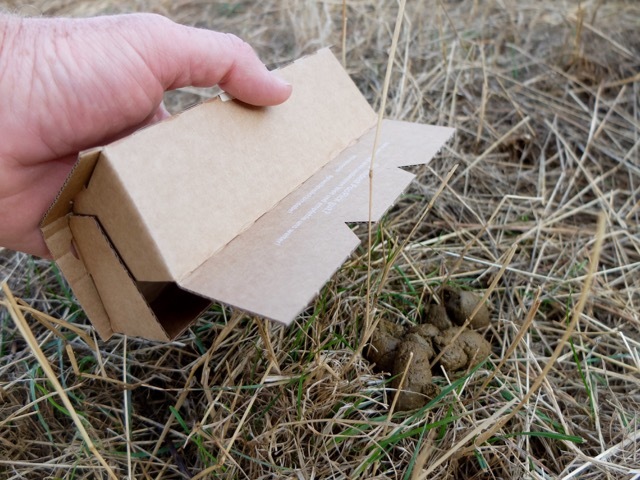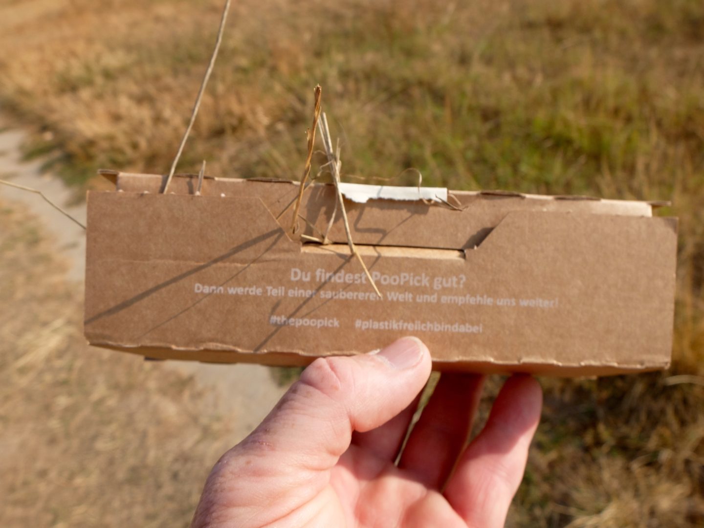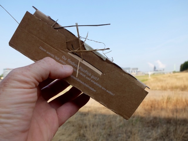 Die Geschichte um "PooPick" hört sich super an. Auf der Homepage erfährt man, dass der PooPick komplett in Deutschland produziert wird, und dann in den gemeinnützigen Nordeifelstätten, einer Einrichtung für Menschen mit Behinderung, per Hand gefaltet, verpackt und versendet wird. Das Material besteht zu 70% aus recyceltem Papier und darüber hinaus aus Resten der Möbelindustrie, der Kleber aus Kartoffelstärke. In kleinen Filmen wird gezeigt, wie man die "Schaufel" zusammenbaut, den Hundekot aufnimmt, und dass die Feuchtigkeit nicht durch das Material durchnässt. Ich bestelle zwei Testexemplare, zahle dafür lediglich das Porto und erfahre auf diesem Weg gleich noch, dass der Versand der Probepackung klimaneutral erfolgt.