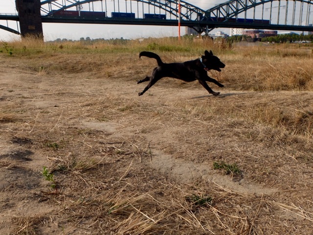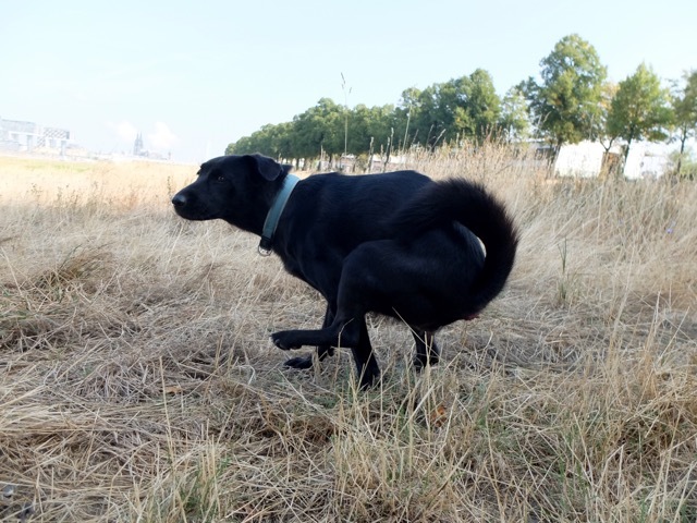 Natürlich muss mein Hund herhalten, bzw. produzieren. Ziel sind die Poller Wiesen auf der rechten Rheinseite - in Köln "Schäl Sick" (falsche Seite) genannt. Auf der Hunderunde am Rheinufer jedoch kann mein Hund nach Herzenslust laufen - und natürlich sein Geschäft erledigen. Das folgt auf dem Fuße. Pepples entledigt sich ihres Darminhalts auf drei Pfoten und benötigt dafür knapp eine Minute. Nach dem Foto komme ich ins Spiel, nehme den "PooPick" aus der Hosentasche, trenne mit dem Daumennagel die Klebelasche und baue die Schaufel. Natürlich habe ich mir das Video vorher angesehen, doch ist der Zusammenbau tatsächlich kinderleicht und in zehn Sekunden getan. Beim ersten Versuch nehme ich den Hundekot erfolgreich und vor allem restlos auf (inkl. einiger verdorrter Grashalme) und schließe den "PooPick"-Bagger. Weder Geruch noch Feuchtigkeit sind festzustellen. Ich nehme mir jedoch vor, die gefüllte Packung während des gesamten Spazierganges in meiner Hand zu halten. Das PooPick hat den Test bestanden - ich konnte weder etwas von Pepples Hinterlassenschaften riechen, noch ist Feuchtigkeit herausgetreten.