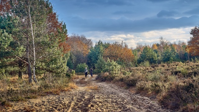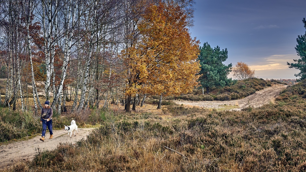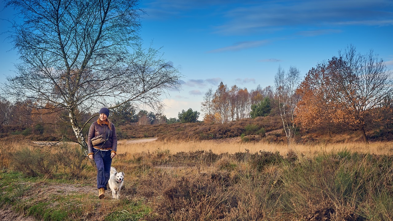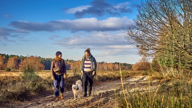 „Den Heidekönig hab ich kennenglernt bei einer Beerdigung. Das war die beste Party!“ Chris Altengarten schultert Kamera, schmeißt 'ne Runde Feigen und stapft vorbei am "Heidekönig", dem Ausgangspunkt einer herbstlichen Hunderunde, auf ein Waldstück zu. Da das Wetter heute am späten Vormittag noch Regen in petto hat, sind wir schon früh unterwegs in der Wahner Heide, weshalb uns köstlicher Flammkuchen und grandiose Forelle blau entgehen - die urige Waldwirtschaft öffnet nämlich erst um 11.30 Uhr. Das wird zwangsläufig also nicht unsere letzte Runde durch die Heide, die sich als Bestandteil der Bergischen Heideterrasse östlich von Köln über etwa 28 Kilometer in nordwestliche Richtung erstreckt. Von den rund 177 Quadratkilometern durchstreifen wir heute zwei, und man erahnt schon, dass es da noch Potential für viele weitere Hunderunden gibt.