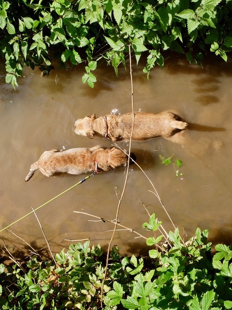 Die Vierbeiner interessiert natürlich absolut nicht, was Reto Neiger so alles erzählt. Tierärztlich werden die beiden von ihren Besitzern behandelt, und da sind sie sicherlich auch in den besten Händen. Emesis und Nausea haben jedenfalls die Hunderunde trotz der Hitze und des fehlenden Schattens sehr genossen und nehmen zum Abschluss ein kühles Bad im Welsbach.