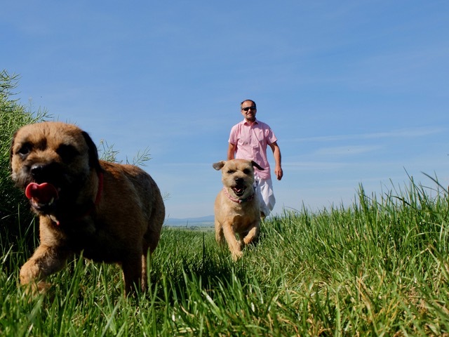 Andreas Moll traf Reto Neiger mit seinen beiden Border Terriern, Emesis (6,5 Jahre) und Nausea (1), zu einer Hunderunde über die Felder von Muschenheim, auf der der Professor berichtete, wie seine ersten Monate in der Gruppe gelaufen sind.
