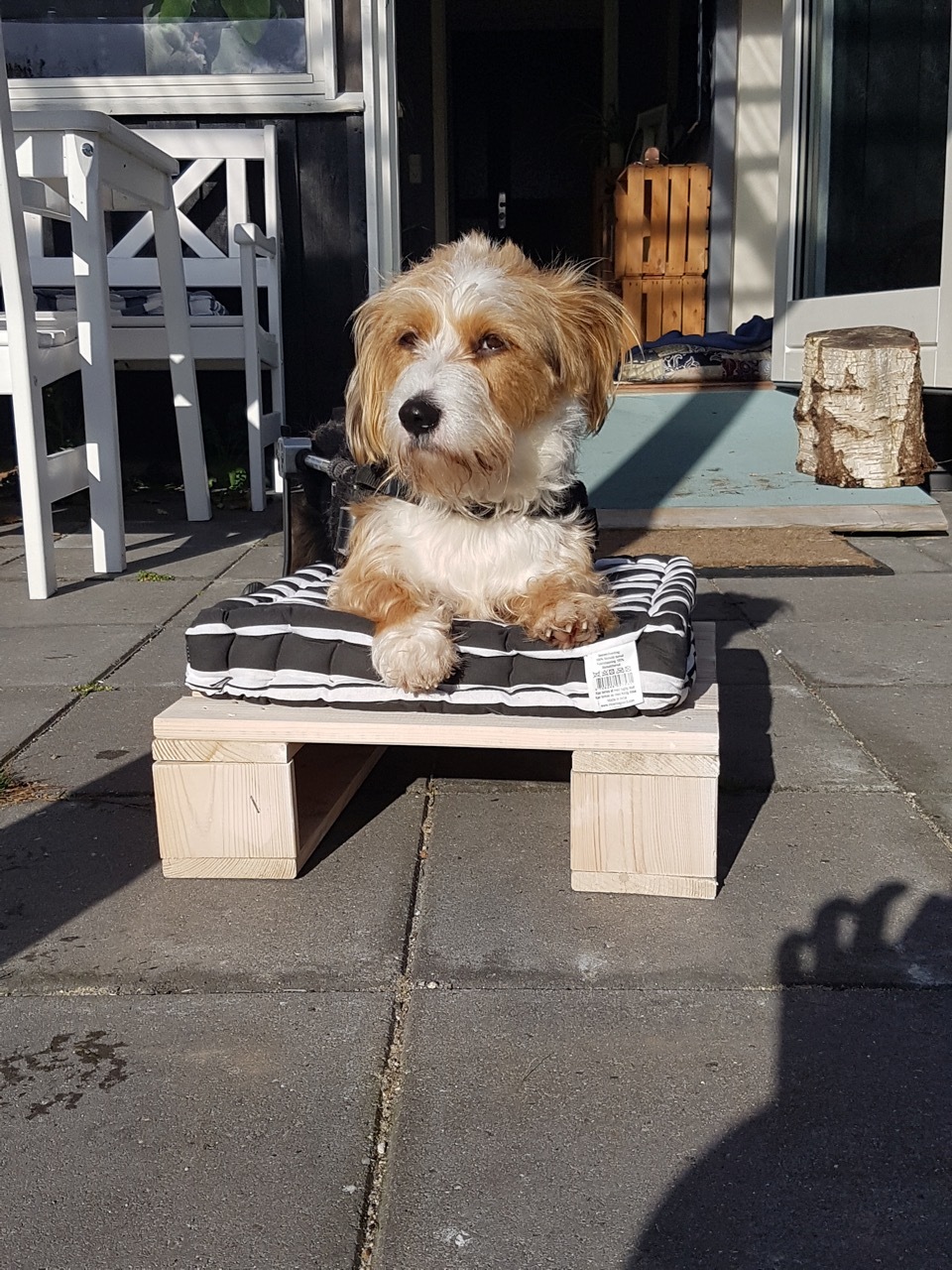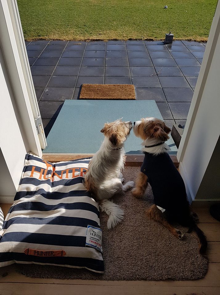 Schnell bauten wir eine Hunderampe vom Wohnzimmer auf die Terrasse, damit er sich ungehindert bewegen konnte. Die ersten Wochen verbrachten wir mit Besuchen in der Uniklinik Kopenhagen. Es war wichtig, die Physioübungen weiter zu machen, und diese wollte ich mir zeigen lassen. Viele Ärzte und Studenten kümmerten sich um uns. Es wurde schnell festgestellt, dass Simba unheimlich viele Reflexe hat. Weil er auch stehen konnte, hatten wir die Hoffnung, dass er vielleicht zu einem "Spinal Walking" kommen könnte. Wir beschlossen, über ein Vierteljahr zweimal die Woche Training auf dem Wasserlaufband und hartes Training zu Hause zu machen. Simbas Muskeln wurden kräftiger, aber das Signal vom Kopf zu den Beinen kam einfach nicht. Nicht ein einziges kleines Zeichen, dass er seine Beinchen bewegen möchte. Keiner von uns war enttäuscht. Wir waren uns von Anfang an einig, dass es toll wäre, aber wir die Erwartungen nicht zu hoch schrauben wollten. Seine Übungen machen wir weiter fleißig zu Hause. Alle drei Monate fahren wir nach Kopenhagen zur Kontrolle. Bis heute zeigt er keine Zeichen von Verspannungen.