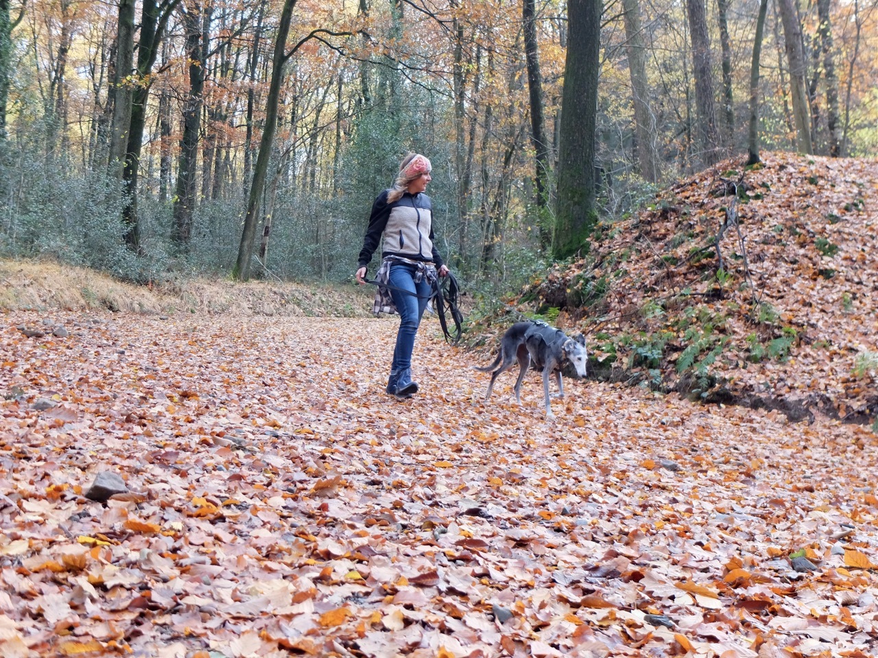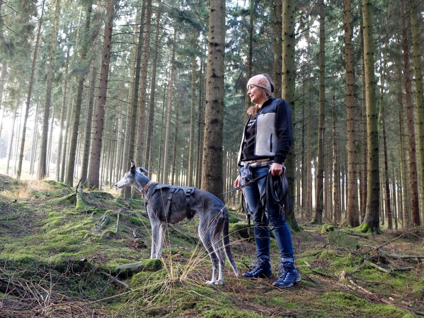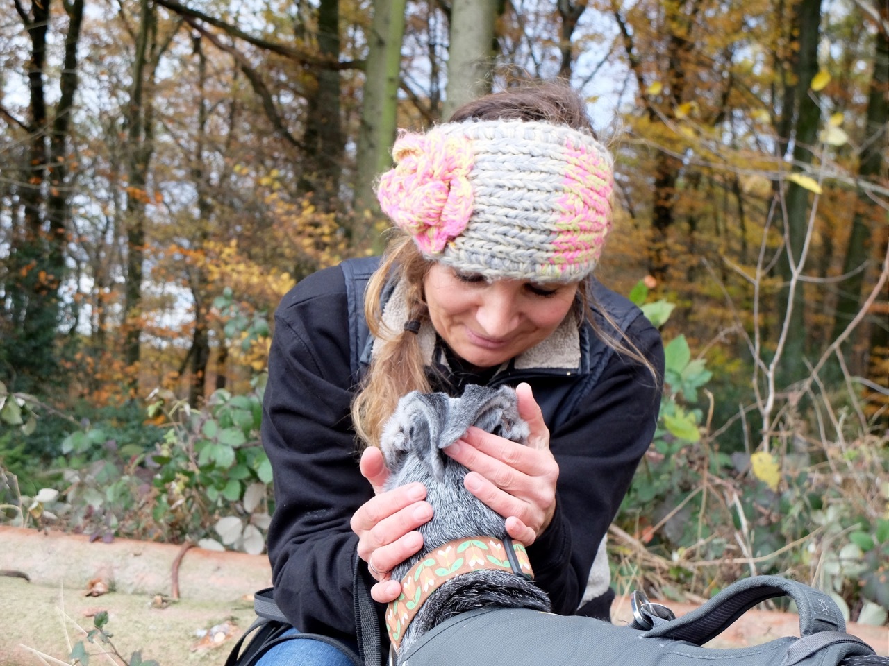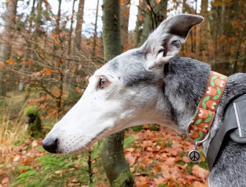 Obwohl Vivi schon etwas älter und nicht ganz gesund ist, legt sie ein gutes Tempo vor. Man kann sich gut vorstellen, dass die alte Dame auch mal einem vorbei springenden Reh hinterher sprintet, wenn ihr Jagdtrieb einsetzt. Daher bleibt die lange Leine dran. Bei dem großzügigen dreistündigen Spaziergang kommt trotzdem keiner zu kurz. „Wir scherzen gerne, dass das die gute Bergische Luft ist“, sagt Simone, angesprochen auf die gute Fitness der Tierschutzhündin. Aber natürlich steckt mehr dahinter. Nicht zuletzt deshalb, weil die Galgo-Dame an Leishmaniose erkrankt ist. Halbjährige Check-Ups beim Spezialisten Dr. Martin Borgers in Ratingen stehen dafür auf dem Programm, mit großem Blutbild und allem, was dazu gehört. „Natürlich ist das auch eine finanzielle Frage“. Trotzdem war das für sie kein Grund, sich gegen die neue Mitbewohnerin zu entscheiden. Im Gegenteil: Eine irgendwie geartete „Behinderung“ oder ein hohes Alter sind zwei ihrer absoluten Muss-Kriterien für die Aufnahme eines neuen Hundes. Meistens kommt beides zusammen.