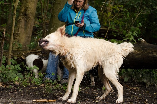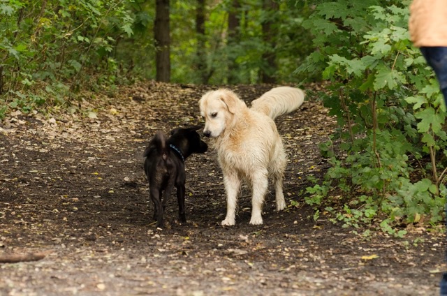 Der Sonntagsausflug endet an diesem Tag, noch bevor der große Regen kommt. Für "Neueinsteiger" ist eine solche Großveranstaltung nur in den ersten Minuten aufregend, da man ohne Erfahrung mit so vielen Hunden auf engem Terrain zwangsläufig unsicher wird. Und wenn sich diese Unsicherheit auf den Hund überträgt, ist man doppelt überfordert. Die Besitzer eines jungen Labradors haben diese erste Hürde nicht überschritten und den Erstversuch vorzeitig abgebrochen. Wer jedoch seinen Hund selbst den Platz im Rudel suchen und finden lässt, wird an einer Gruppenwanderung wie dieser sehr großen Gefallen finden. Auch wenn der eigene Hund das Wasser scheut, wie der Teufel das Weihwasser.