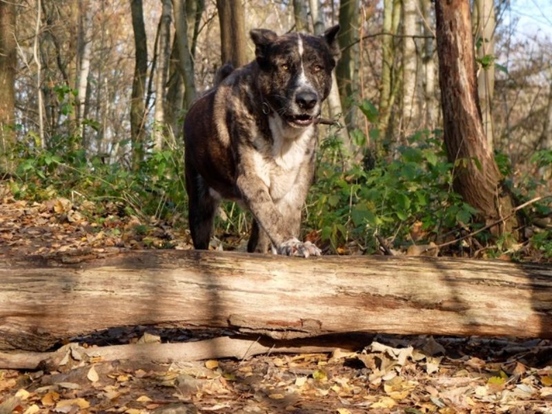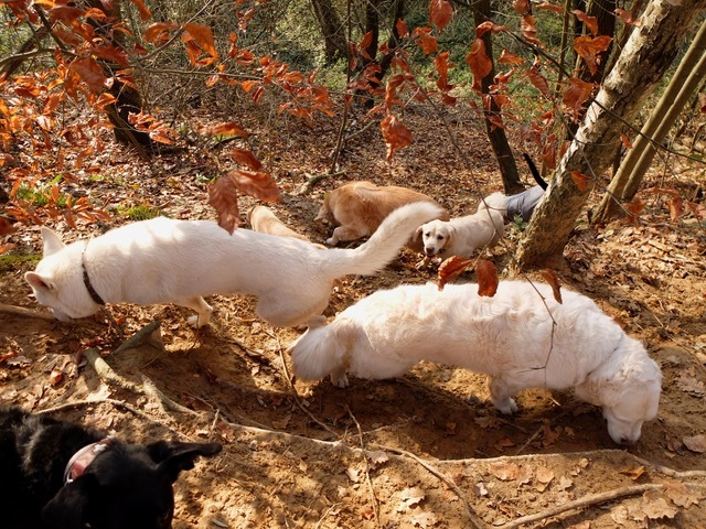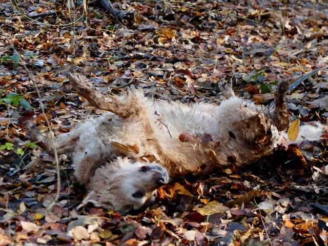 Der 50 Kilogramm schwere Hirtenhund Faraón, der mit seinen abgeschnittenen Ohren vier Jahre lang in spanischen Tierheimen lebte und bis vor zwölf Monaten nur Betonwände kannte, ist der Erste am Wasserloch. Nach und nach kommen die anderen Rudelmitglieder, nehmen einen Schluck oder stürzen sich mit Lust ins kühlende Nass. Es gibt natürlich auch einige wasserscheue Tiere - so wie beispielsweise mein Hund Pepples - die diesem Programmpunkt mit gebührendem Abstand begegnen. In diesem Natur-Spa-Bereich gibt es aber noch etliche Möglichkeiten, sich zu beschäftigen. Golden Retriever-Hündin Emma, die als Tagesgast zu der Löckenhoff'schen Gruppe kommt seitdem sie fünf Monate alt ist, wälzt sich genüsslich im nassen Laub, während .
