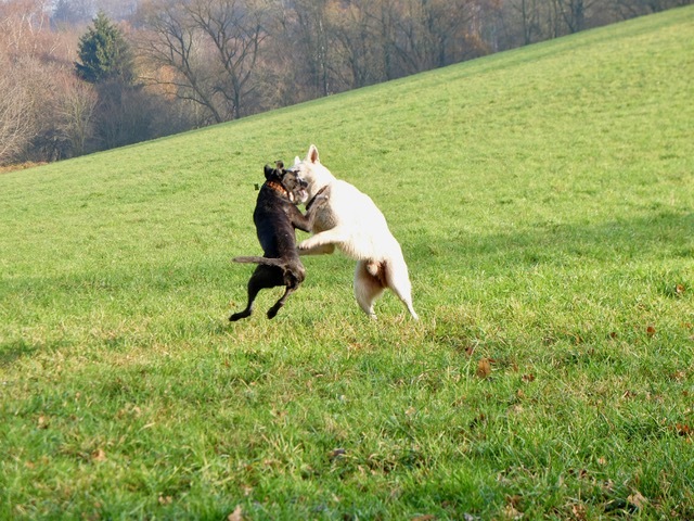 Die anderen auf Haus und Terrasse verteilten Hunde, werden langsam ungehalten, denn der allmorgendliche Ausflug steht an. Die "Chefin" holt die vierbeinige Crew ins Wohnzimmer, nicht ohne mir den Auftrag zu geben, mich mit Pepples in die Ecke des Zimmers zu stellen und mich erst einmal schützend vor meinen Hund zu stellen. Zuerst betritt ein weißer Schäferhund den Raum, nimmt Kontakt mit uns Neulingen auf, kläfft ein wenig und macht deutlich, dass er hier etwas zu "sagen" hat. "Wolfi", der fünfjährige Rüde, der vor zwei Jahren sein Zuhause verloren hat und von Löckenhoff aufgenommen wurde, ist ihre rechte Hand, ihr Helfer. Boxerhündin Chanel hingegen ist überglücklich, dass Pepples mit dabei ist, ist sehr lustig und bringt direkt Schwung in die Bude. Der Rest der Rasselbande freut sich zwar über die Neuen, wollen jedoch unbedingt ihre Runde drehen.