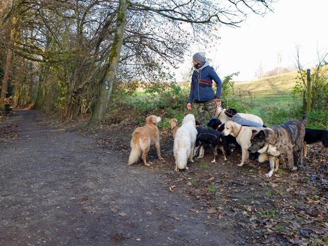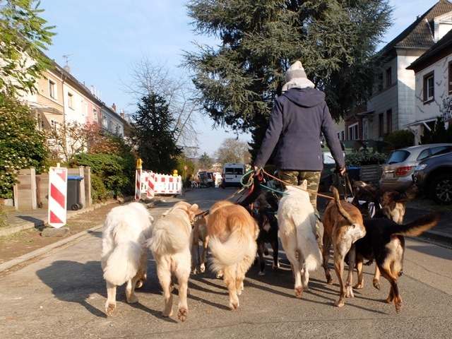 Kommen dem Rudel fremde Hunde, Jogger, Spaziergänger oder Pferde entgegen, nimmt Löckenhoff jedes Mal die Energie aus der Gruppe, wirkt beruhigend auf die Tiere ein und versammelt ihr Rudel in einer Nische am Rand des Weges, bzw. der Straße. Dieses Ritual steckt im wahrsten Sinne an, denn auch ich als Begleiter der Gruppe merke, wie ich tief einatme und der Begegnung gelassen entgegensehe. Genauso geht es den Hunden, die mit gleicher Freude wieder weiterziehen, nachdem die Chefin ihnen die Erlaubnis durch ene kleine Geste gegeben hat. Auch als dem Rudel kurz vor dem Zielpunkt eine Kindergartengruppe entgegengeht, entspannen sich beide Parteien, beäugen sich interessiert und gehen kurze Zeit später ihrer Wege. Am "Gut Grosseforst" werden alle wieder angeleint - keiner der Hunde lässt sich von den Pferden irritieren, von den Hofhunden oder von dem heranfahrenden LKW aus der Ruhe bringen. Nach gut 90 Minuten kommen wir wieder am Ausgangspunkt des ausgiebigen Dogwalks an.