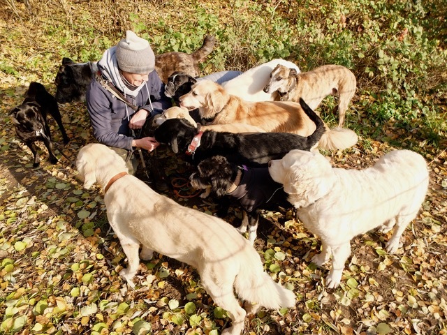 Aufgeregt bin ich, als ich Ursula Löckenhoff im Düsseldorfer Stadtteil Gerresheim besuche, denn ich darf sie mit meiner Hündin Peppels im Schlepptau auf einer Hunderunde begleiten. Was mich jedoch nervös macht ist die Tatsache, dass noch elf weitere Hunde mit von der Landpartie sind. Für Ursula Löckenhoff sollte genau dieser Umstand kein Problem darstellen, ist sie doch Expertin für Mehrhundehaltung und hat ihre Erfahrungen in dem Buch "DogTeam" (Kosmos Verlag) zusammengefasst.