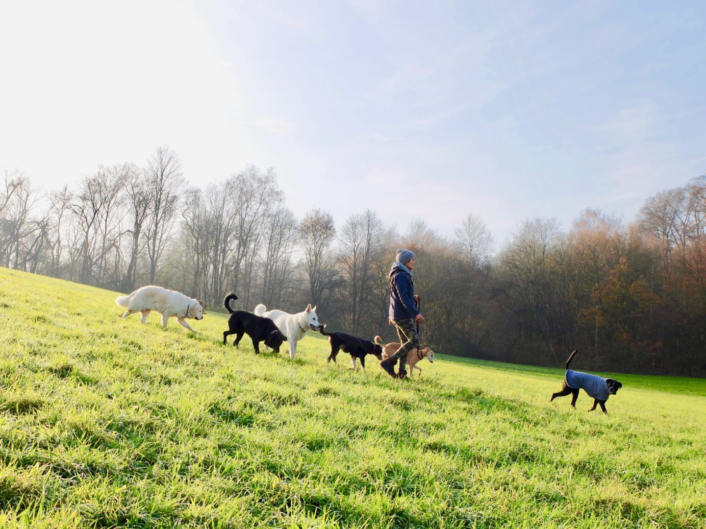Weiter geht es auf der Hunderunde ("Das dreckige Dutzend im Gerresheimer Abenteuerland") durch ein kleines Waldgebiet, in der die Gang auch weiterhin nah beieinander läuft - bis zum nächsten Programmpunkt. Ein neuer Raum, ein kleiner Höhepunkt, ein weiteres Ritual. Auf einer Lichtung nahe an einem Abhang wirft die Chefin zwei Hände voll Leckerlis in die Büsche. Die Hunde sind begeistert, suchen aufgeregt danach, finden natürlich alles und verdrücken das kleine Picknick in Nullkommanichts. Löckenhoff zeigt auf den Übergang zum Wald in ca. 20 Meter Entfernung, wo ab und an Wild auftaucht. "Da die Hunde jedoch ihren Raum kennen und der Waldrand nicht mehr dazu gehört, lassen sie sich auch durch die Rehe nicht aus der Ruhe bringen", erklärt die Fachfrau, die noch einmal darauf hinweist, dass sich in ihrer Gruppe einige jagdaffine Hunde befinden. Weiter geht es durch den Wald bis zu einer wunderschönen Wiese. Dabei bildet Galgo-Mix "Herr Rossi", der bei einem Kampf in einem spanischen Tierheim eines seiner Beine verloren hat, das Ende und passt auf seine Truppe auf. Wer gedacht hätte, die Hunde würden mit Karacho auf ihren "Spielplatz" laufen, hat die Rechnung nicht ohne die Regeln dieser Hundegruppe gemacht. Löckenhoff macht sich erst ein Bild vom Gelände, hält nach möglichen Gefahren Ausschau und gibt erst dann ihren Begleitern das "GO!"