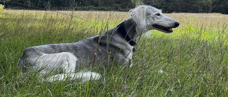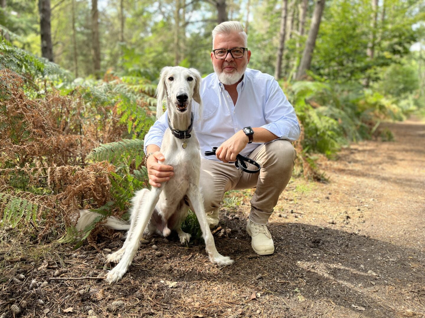 Kenai, der ca. 13 Jahre alte persische Windhund, fühlt sich sichtlich wohl auf dem Spaziergang. Der Rüde, der sich laut Witte durch eine "gepflegte Ignoranz" auszeichnet, liebt den Rundweg "Birgeler Urwald", der nur einen Steinwurf von Wittes Haus entfernt liegt. Das Deutsche Wanderinstitut hat diese Hunderunde, die teils über schmale Waldpfade und unter umgestürzten Baumstämmen hindurchführt, zertifiziert und als "Premiumwanderweg" ausgezeichnet. Hier kommt der Berater schnell zur Ruhe und lässt oft auch sein Mobiltelefon zu Hause, um total abschalten und die Seele baumeln lassen zu können. Zu Kenai kam Witte "wie die Jungfrau zum Kinde", als ihm eine Tierärztliche Fachangestellte (TFA) auf dem Bielefelder Kleintierkongress den Saluki-Rüden mit der Ansage in die Hand drückte, dass der Hund ein neues Zuhause suche. Witte war schockverliebt und musste nicht lange überlegen und nahm den schönen Hund zu sich.