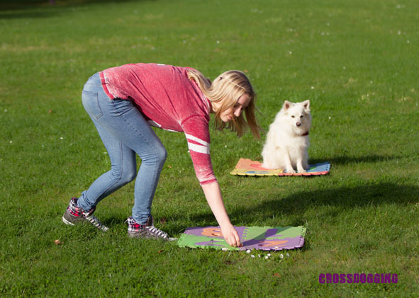 Eine Aufgabe aus dem Crossdogging könnte somit also lauten: Gehe mit Deinem Hund auf eine Hürde zu, dabei hältst Du einen Löffel, auf dem ein Ball liegt in Deiner Hand. Vor der Hürde bleibst Du stehen und dirigierst den Hund mit der noch freien Hand einmal außen um die Hürde herum. Ist der Hund wieder bei Dir angekommen, bringe den Hund ins Sitz. Nun lasse den Ball vom Löffel fallen. Erst wenn der Ball still liegt fordere Deinen Hund auf, ihn zurück zum Startpunkt zu tragen.