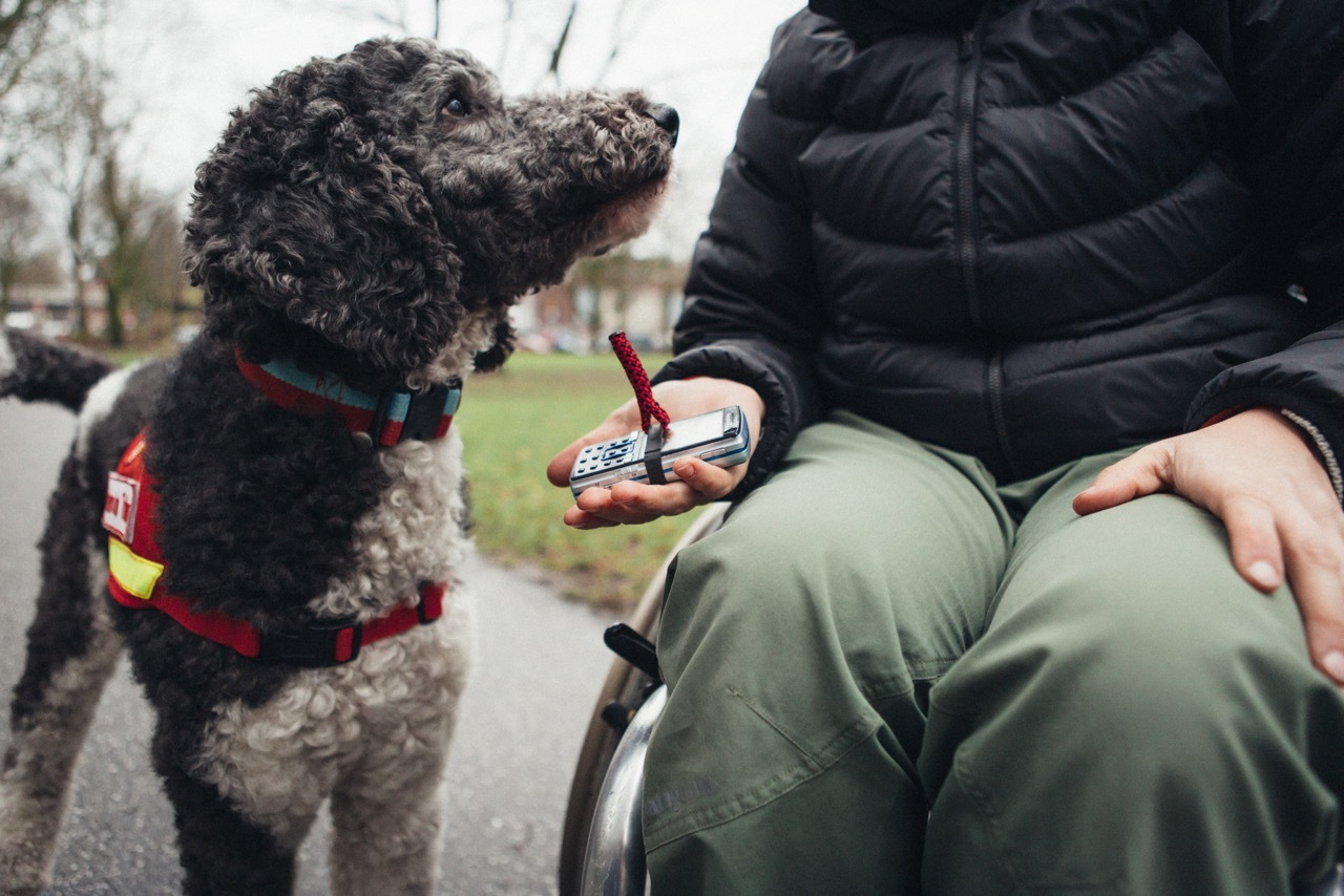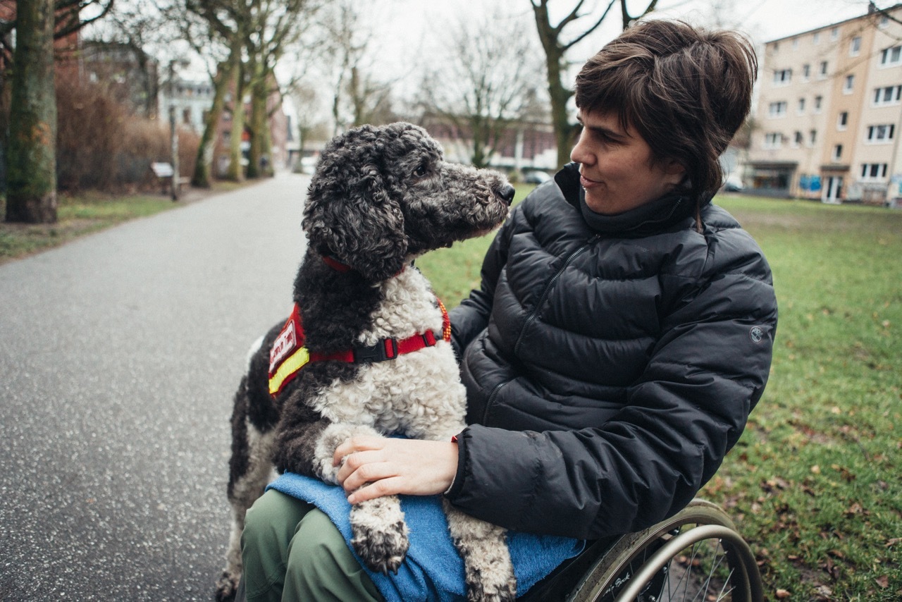 Assistenzhunde helfen Menschen mit unterschiedlichen Beeinträchtigungen. Sie sind für ihre jeweiligen Menschen Augen, Ohren, Nase, Hände, Beine und psychische Stütze. Sie führen um Hindernisse herum, zeigen Geräusche an, heben Sachen auf, holen Hilfe, geben Halt. Findus ist einer der wenigen Hunde, die bei mir in stationärer Ausbildung vorbereitet werden. Im Gegensatz zu den Hunden, die von ihren Besitzer mit meiner Unterstützung selbst ausgebildet werden, lernt Findus in den sieben Monaten, in denen er bei mir lebt, schon alles, was er in seinem Job können muss. Erst dann zieht er zu seinem zukünftigen Besitzer. Der junge Mann sitzt im Rollstuhl und braucht einen zuverlässigen Begleiter, der ihm Sachen herbeibringt, in Notsituationen Hilfe holt, Schalter betätigt und Türen öffnet. Letzteres ist auch bildlich gemeint, denn ein Assistenzhund kann eine gute Kontaktbrücke abgeben. Hat eine Person mit einer sichtbaren Beeinträchtigung einen Hund dabei, vielleicht sogar mit einer Kenndecke, die ihn als Assistenzhund kennzeichnet, so siegt die Neugier über der Kontakthemmung.