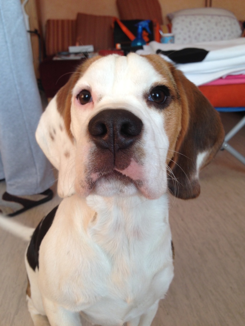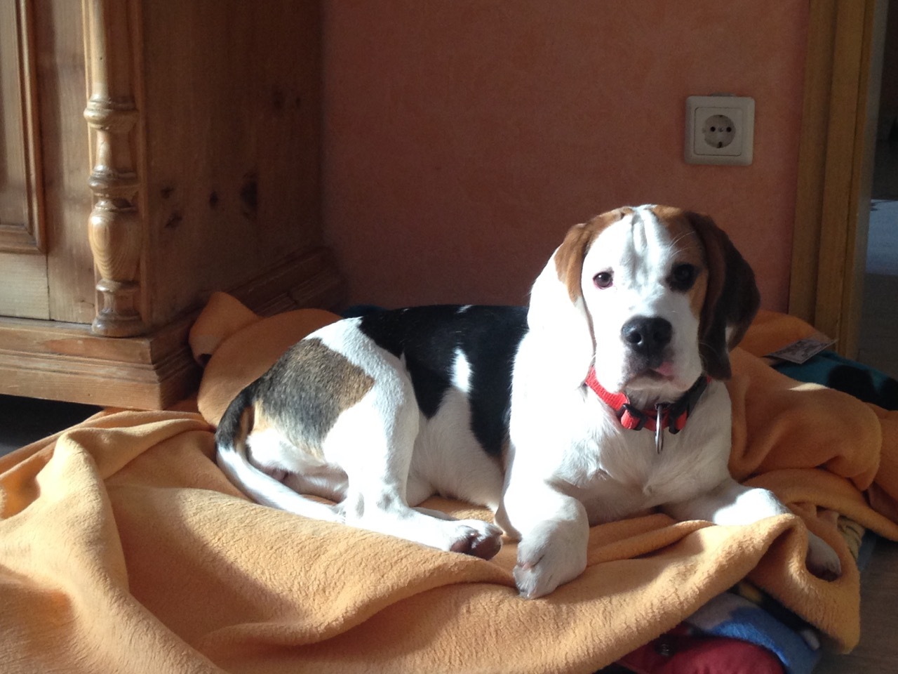Drei Wochen später stand ich bei der Kundin vor der Haustür, klingelte und war gespannt. Ich muss zugeben, dass ich eine Affinität zu eigenständigen Hunden (Podenco), Meutejäger (Beagles), Solitärjäger (Jack Russel, Dackel) und Jagdhunden habe. Die Kundin öffnete mir die Tür, ohne dass die kleine Beagle-Dame bellte. Wir setzten uns, und Amy sprang gleich auf die Couch, um sich zwischen uns zu drängeln.