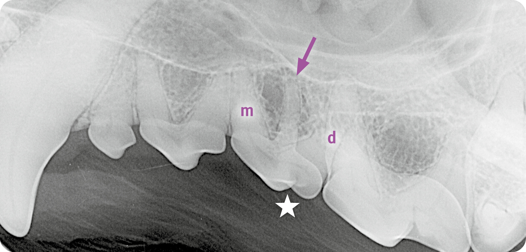 Röntgenbeispiel Hund: Dieser Röntgenbefund (Abb. 2) ergibt eine überzählige Wurzel (➡️) zwischen mesialer (m) und distaler (d) Wurzel des dritten Prämolaren (⭐️) im linken Oberkiefer. Dahingegen ist das Röntgenbild des Oberkiefers rechts unauffällig.