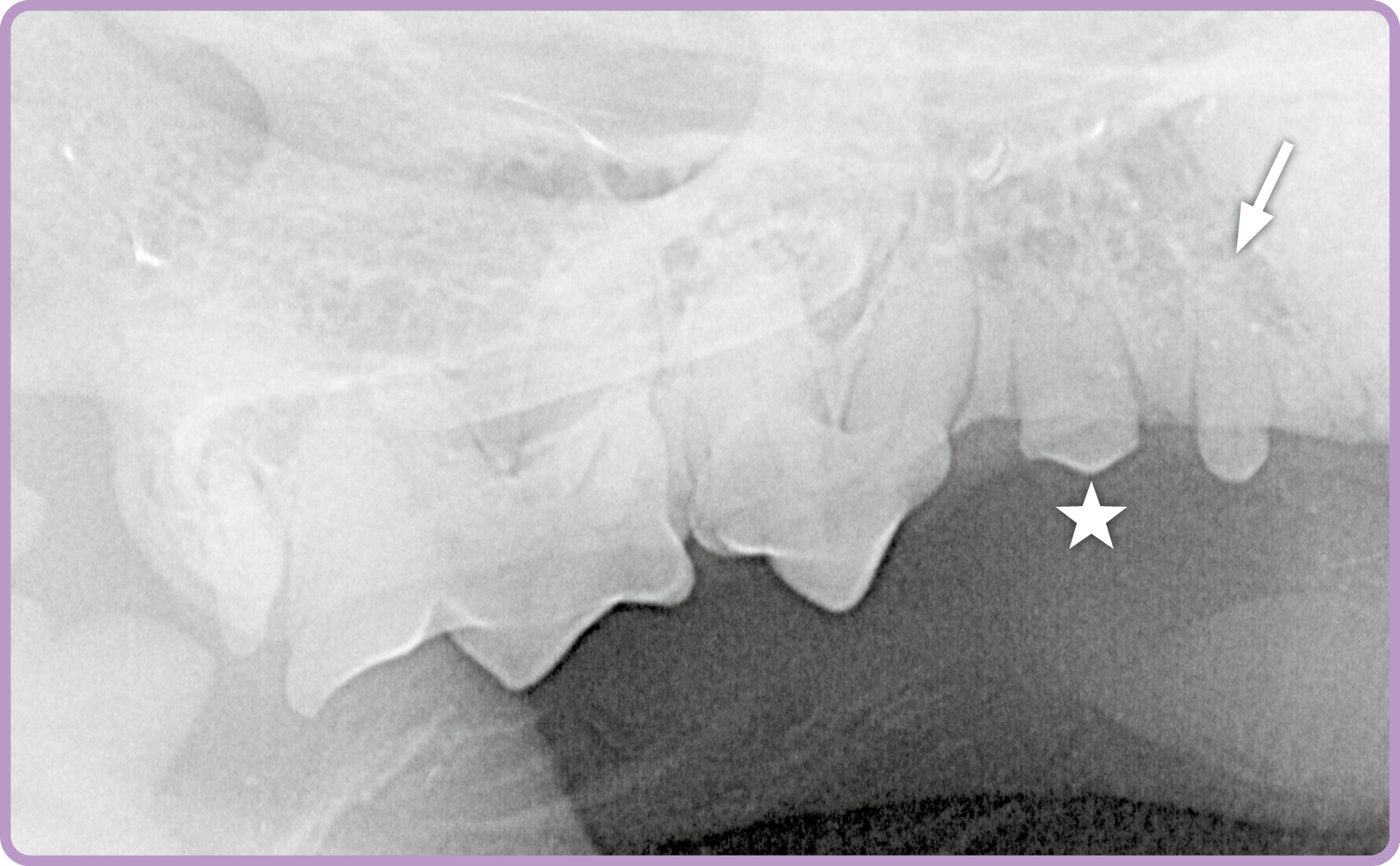 Röntgenbeispiel Katze: Die Aufnahme einer Katze (Abb. 1) zeigt eine überzählige Wurzel des zweiten Prämolaren (⭐️) im Oberkiefer rechts. Darüber hinaus wird auch ein zusätzlich angelegter Zahn im Bereich des zweiten Prämolaren