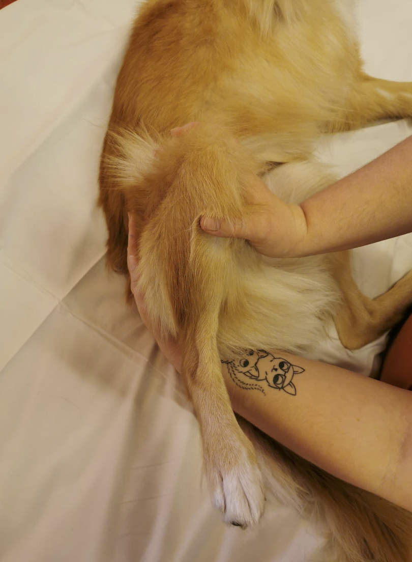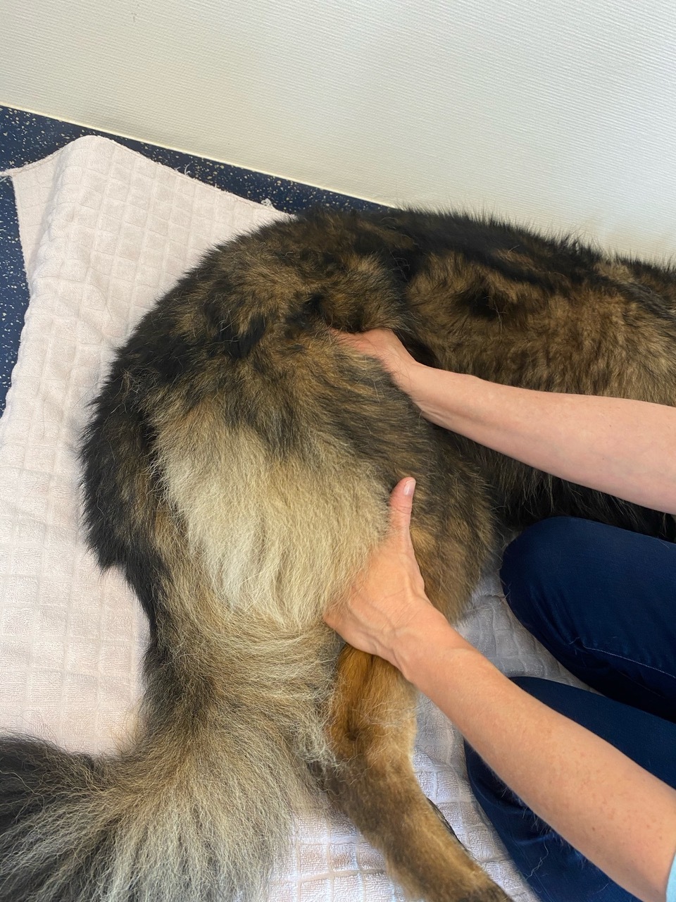 - Massage: 1-3 Mal pro Tag werden der Rücken und die Hintergliedmaßen massiert, bei verspannter Muskulatur der Vordergliedmaßen diese miteinbeziehen. Bei Hypertonus wird lockernd massiert, bei schlaffer Lähmung tonisierend.