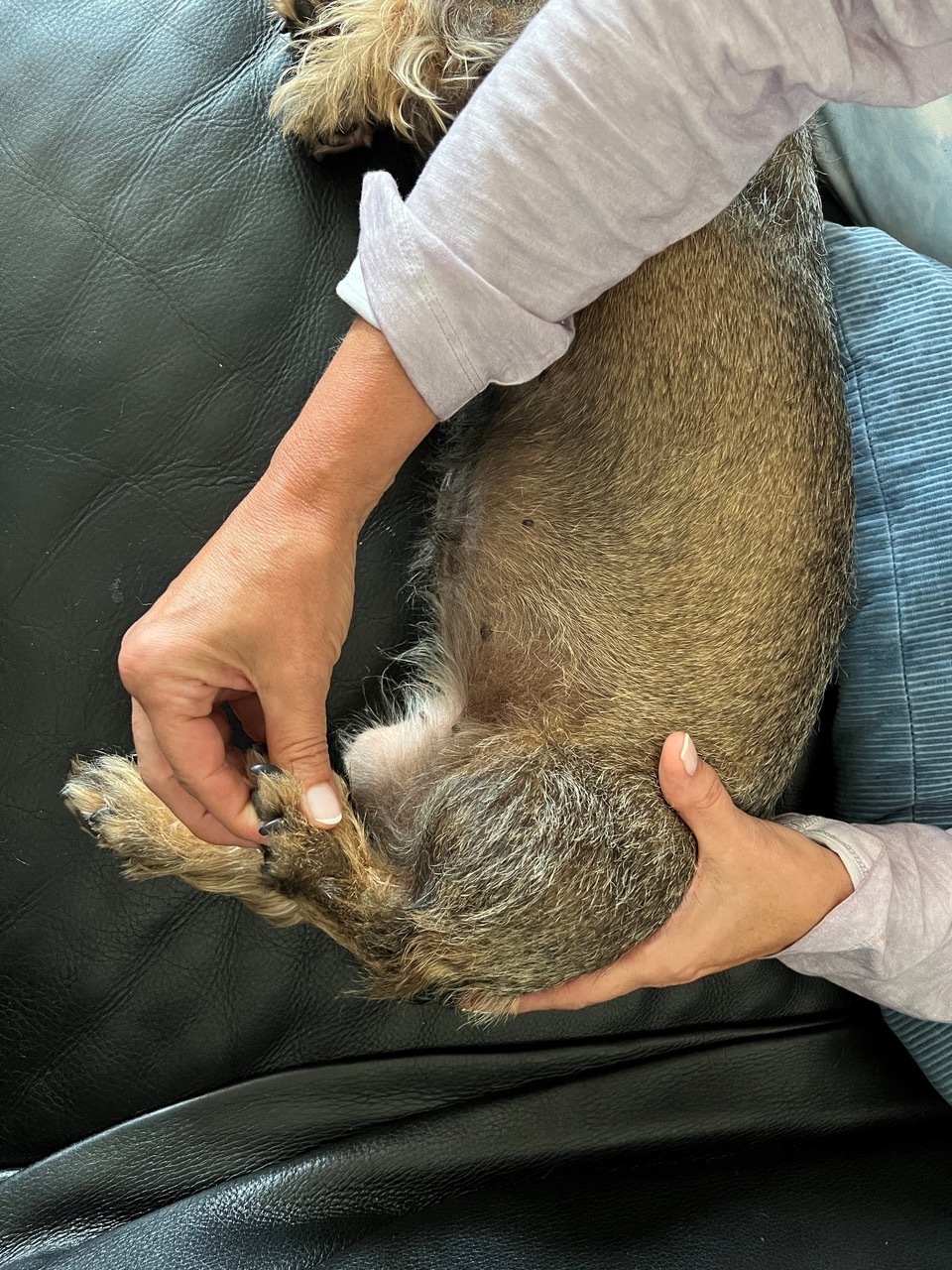 Bei der klassischen Massage werden fünf Grundhandgriffe unterschieden: Effleurage (Streichung), Petrissage (Knetung - Abb. 1), Friktion (Reibung), Tapotement (Klopfung) und Vibration (Schüttelung). Unter passiver Bewegung wird ein durch die Therapeut:innen sanftes Bewegen von Gelenken (Abb. 2), sowie das Mobilisieren der Muskulatur (Dehnen) und des Nervensystems (neurales Gleiten) verstanden. Der Patellar- und Flexorreflex sind für das reflexinduzierte Training (RIT) gut geeignet (Abb. 3). Die Durchblutung und Beweglichkeit wird gefördert, und so bleigt das Bewegungsgefühl erhalten. Bei eingeschränkter Beweglichkeit kommt es sehr schnell zu Kontrakturen, zu Gelenksversteifungen und Knorpeldegeneration. Können die Tiere nicht selbst aufstehen, müssen sie täglich mehrmals aufgestellt werden. So bekommt der Patient wieder ein Gefühl für die normale Körperhaltung und die Stellung der Beine im Bezug zum Körper.