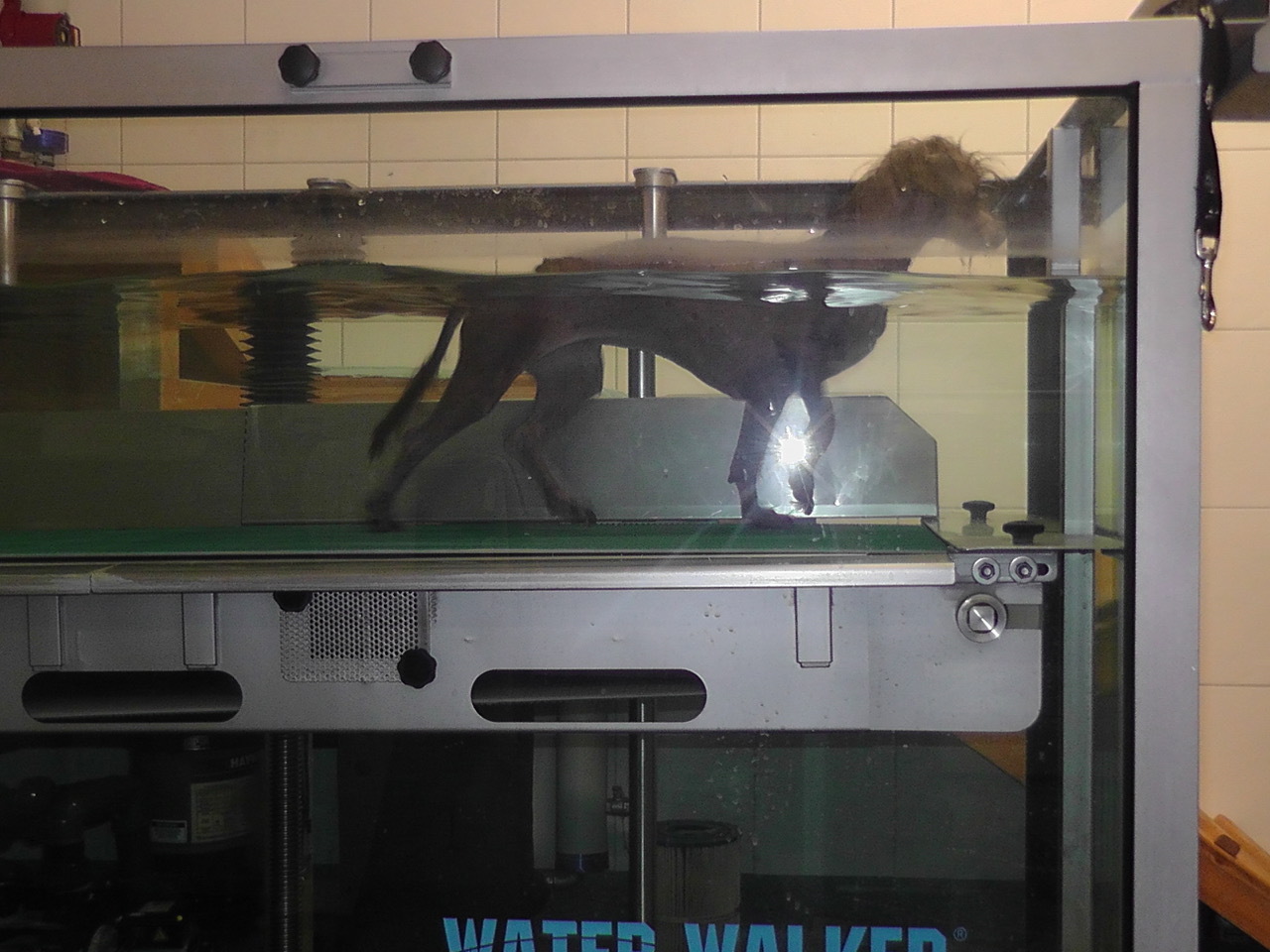 Die Arbeit im Wasser steigert die Kraft und Ausdauer der Muskulatur. Das Bewegungsausmaß der Gelenke sowie die Ausdauer des Herz-Kreislaufsystems reduzieren die Schmerzen. Im Wasser ist der Körper leichter und wird stabilisiert. Dadurch können auch an Land nicht stehfähige Tiere bewegt und auch Tiere mit schmerzhaften Gelenken einfacher und mit geringerer Belastung trainiert werden. Ein Muskelaufbau ist so in einer früheren Phase der Rehabilitation möglich. Durch den vom Wasser ausgeübten Druck werden Schwellungen reduziert. Die Druckrezeptoren und Thermorezeptoren werden stimuliert und damit die Schmerzen gesenkt, die Körperwahrnehmung gesteigert und das Wohlbefinden gefördert. Die Hydrotherapie auf dem Unterwasserlaufband (UWL) bietet die optimalen Voraussetzungen für die Wiedererlangung der normalen Bewegungsabläufe (Abb. 5). Wunden werden mit einer wasserabstoßenden Salbe (z.B. Zinksalbe) geschützt.