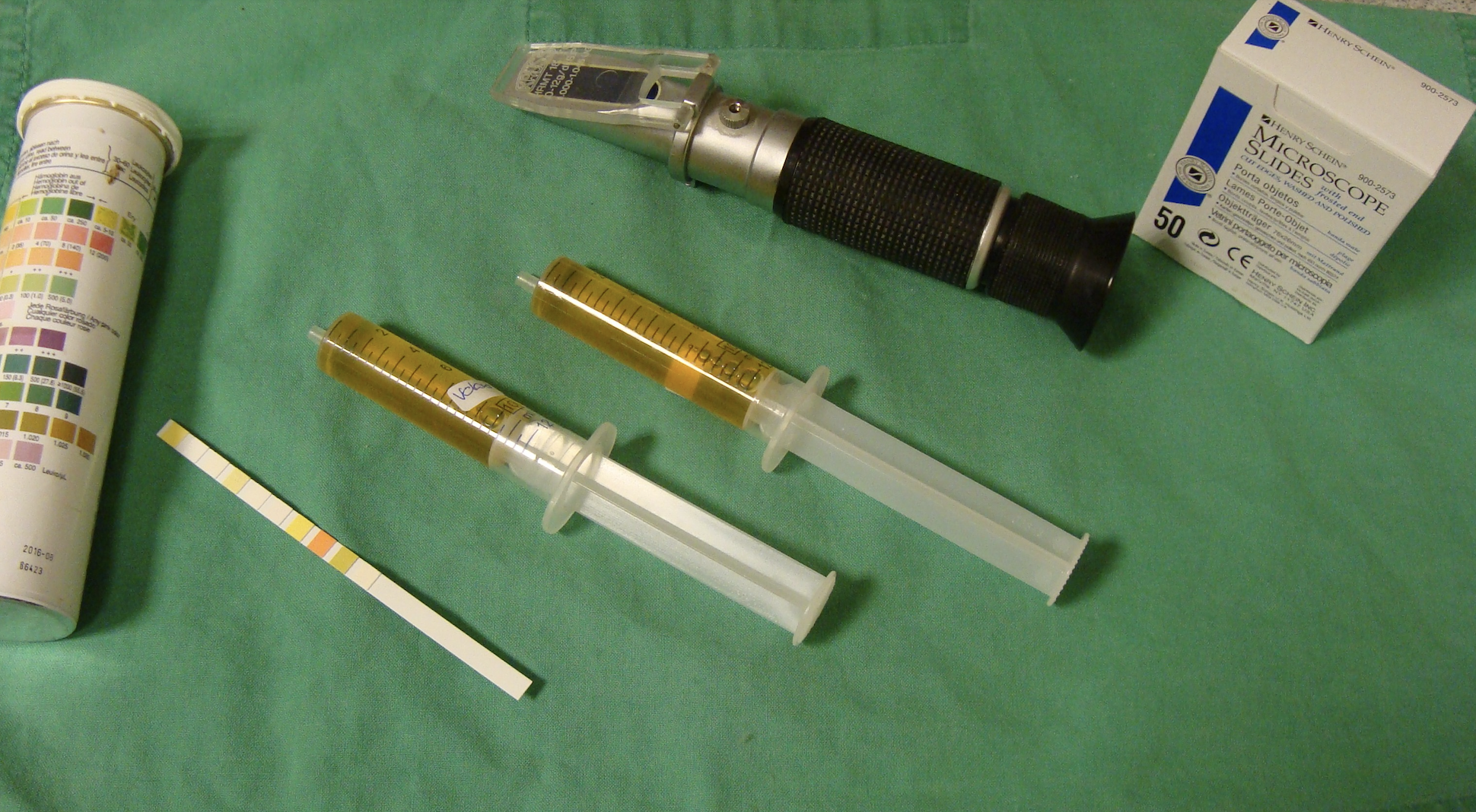 Die Urinanalyse liefert bereits in sehr frühen Stadien der Erkrankung Hinweise, wenn sich die Nierenfunktion verschlechtert. Die Harngewinnung per Zystozentese ist in der Regel die beste Wahl, da daraus auch eine bakterielle Kultur angelegt werden kann. Die harnspezifische Dichte (USG) gibt einen ersten Hinweis auf die Konzentrationsleistung der Niere: Ein Wert ≥ 1,035 macht eine renale Azotämie bei gleichzeitiger Kreatininerhöhung und inaktivem Sediment weniger wahrscheinlich, während eine wiederholt inadäquate Konzentration (häufig < 1,035) den Verdacht auf eine CKD stützt. Einzelwerte sind störanfällig; am sinnvollsten ist eine Verlaufsbeurteilung anhand von mindestens zwei (besser drei) Proben, idealerweise vor Infusionen.
