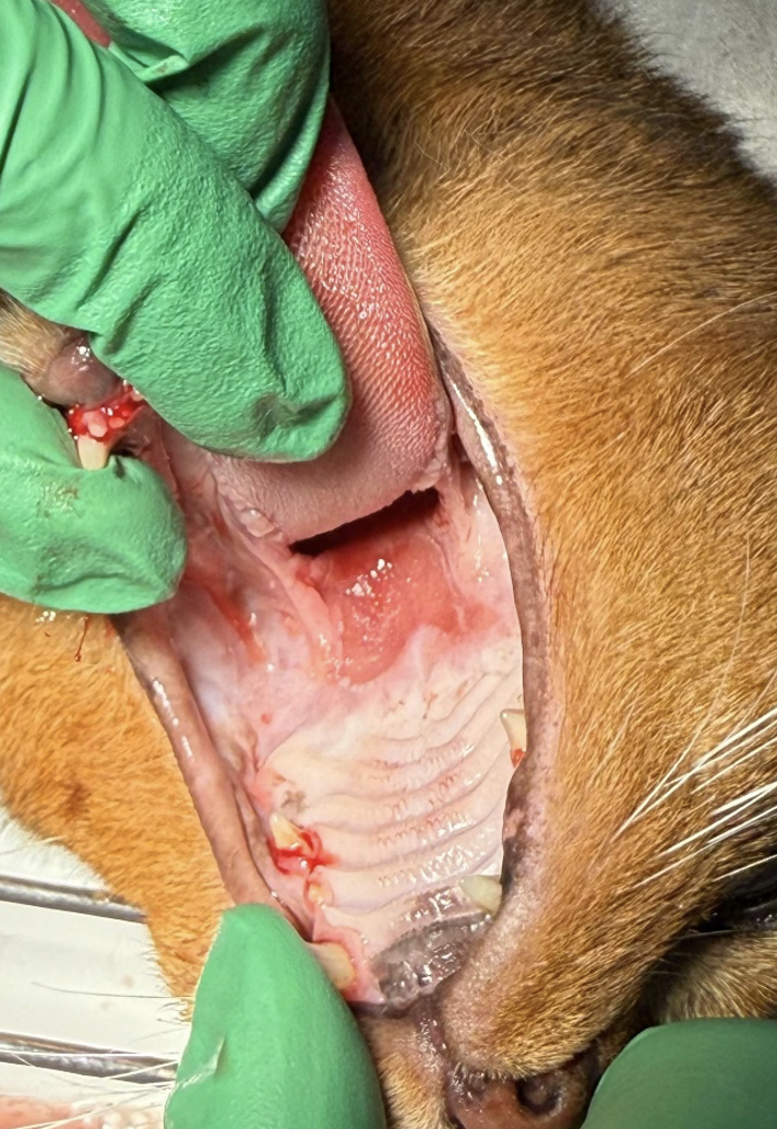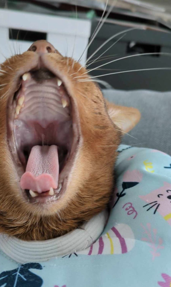 Vorgestellt wurde der Abessinier-Kater „Nixon“, der zum Zeitpunkt der Erstaufnahme 3 Jahre alt war (heute: 5 Jahre). Der Kater wurde von einer Kollegin mit der Diagnose „Eosinophiles Granulom am Gaumen“ überwiesen. Bereits vor der Überweisung war eine intensive Therapie mit Kortison und Ciclosporin von August 2023 bis Mai 2024 ohne anhaltende Besserung erfolgt. Aufgrund des schlechten Allgemeinzustandes, starkem Gewichtsverlusts und der Therapieresistenz wurde eine Euthanasie in Erwägung gezogen.