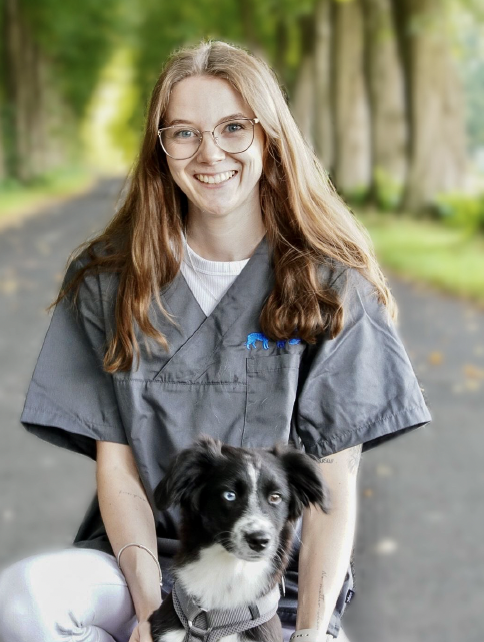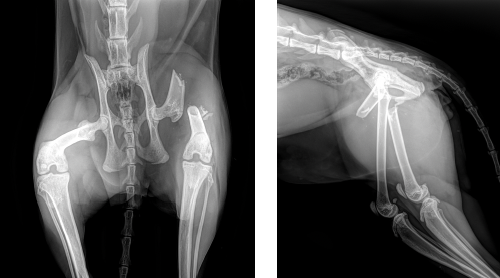 Physiotherapeutische Rehabilitationsmaßnahmen: Röntgenkontrolle nach 2, 6 & 12 Wochen. Die Fraktur war 8h post-OP bereits belastbar. 24h post-OP konnte die erste rehabilitationsmedizinische Einheit mit Physiotherapeutin Lea Jenhard stattfinden, im Anschluss wurde „Fussel“ nach Hause entlassen. Zustand nach 14 Tagen: Das Röntgenbild zur Kontrolle 14 Tage post-OP ergab einen zufriedenstellenden Heilungsverlauf. Die Fraktur der Hintergliedmaße wird aller Voraussicht nach komplikationslos abheilen. Die Fäden wurden gezogen, es bestand keine Wundschwellung.