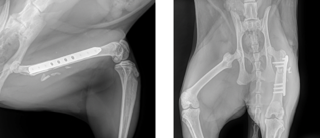 Im chirurgischen Konsil wurde der Entschluss gefasst, zuerst die Fraktur des Femur zu versorgen. Nach vollständiger Ausheilung dieser, wird die Gesamtsituation re-evaluiert. Besteht dann weiterhin eine vollständige oder teilweise Lähmung der rechten Vordergliedmaße, kann diese nach Bedarf in einer zweiten Operation amputiert oder das Karpalgelenk mittels Arthrodese versteift werden. Die Chirurgische Versorgung der Femurfraktur erfolgte inhouse durch Neuro- und Orthopädischen Chirurgen Marcel Sieger und sein Team. Über den kraniolateralen Zugang wurde die Trümmerfraktur mittels Überbrückungsplatte stabilisiert. Die Faszien Sub- und Intakutannaht erfolgte fortlaufend, die Hautnaht mittels Reverdin.