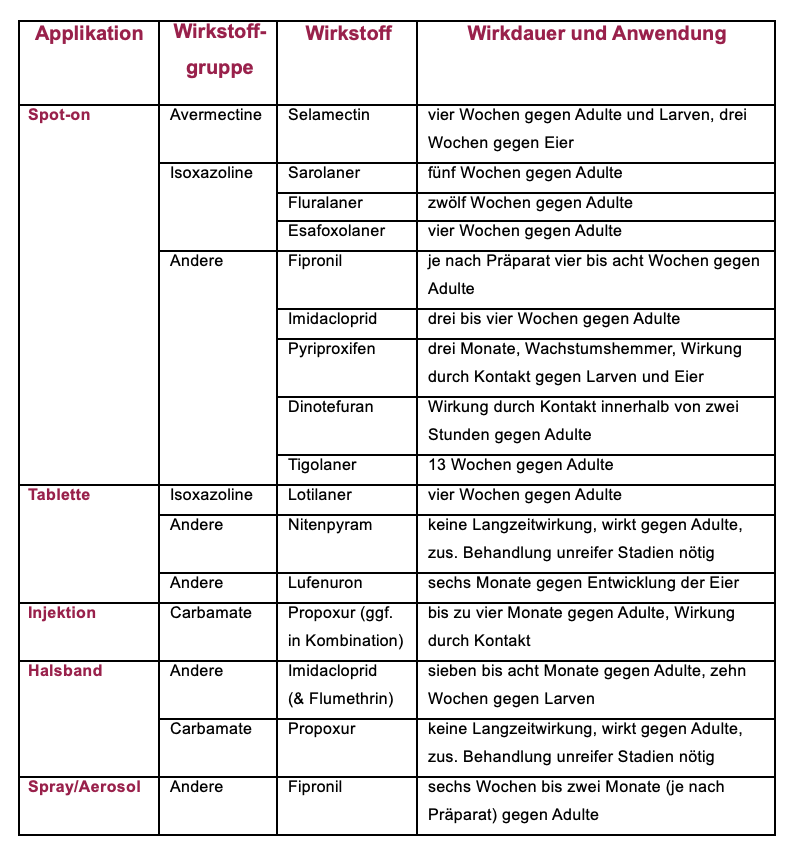 Für Katzen stehen unterschiedliche Wirkstoffe (häufig als Kombinationspräparate) und Darreichungsformen zum Ektoparasitenmanagement zur Verfügung (s. Tabelle 1). Einige Ektoparasitika bei Hunden enthalten hoch dosierte synthetische Pyrethroide wie Permethrin, die in diesen Konzentrationen für Katzen giftig sind. Lediglich das Pyrethroid Flumethrin kommt in Halsbändern für Katzen zur Anwendung. Es ist unbedingt darauf zu achten, für Katzen lediglich Arzneimittel anzuwenden, die für sie zugelassen sind. In Haushalten, in denen sowohl Hunde als auch Katzen leben, empfiehlt es sich außerdem, für die Behandlung der Hunde auf permethrinhaltige Präparate zu verzichten, da auch enger Kontakt zu einem entsprechend behandelten Hund für eine Katze gefährlich ist.