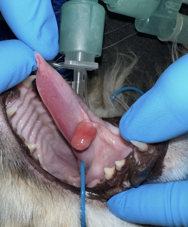 Zwei Wochen später wurde die Umfangsvermehrung in einer zweiten OP, mittels Skalpells, in toto reseziert. Intra OP fiel eine zweite, ca. bohnengroße Umfangsvermehrung der Schleimhaut am Zungenboden weiter distal auf, welche ebenfalls in toto reseziert wurde (Abb. 2 & 3). Der Wundverschluss erfolgte wieder mit monifilen, resorbierbarem Nahtmaterial. Außerdem wurde eine Zahnsanierung mit mehreren Zahnextraktionen durchgeführt.