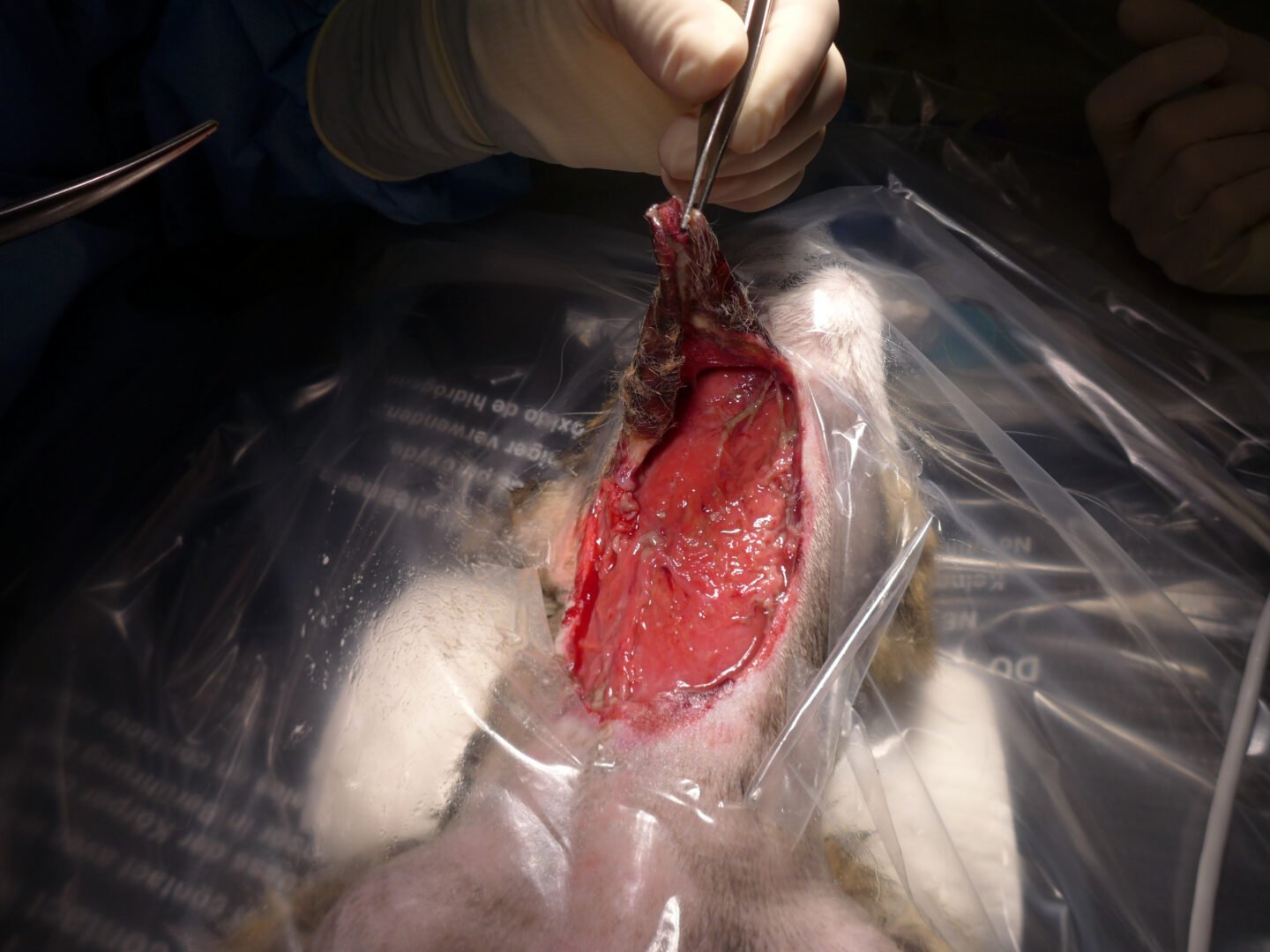 Beschrieben wird die Behandlung einer großflächigen Wunde nach Abszess im Bereich Wange/ventraler Hals bei einem „unberührbaren“ Kater. Neben der detaillierten Darstellung des Heilungsverlaufes der Wunde und den dabei angewandten operativen Maßnahmen, Materialien und Verbandsschutztechniken, wird ebenso auf gescheiterte Maßnahmen, Händling des angstaggressiven Katers und die notwendigen Techniken zur Sedation eingegangen.
