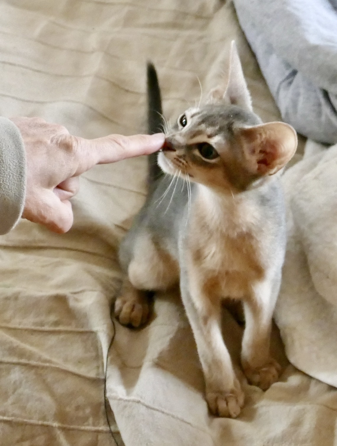 Mit einer einfachen Grundübung – dem Nasentarget - kann ein Kitten ab dem ersten Tag lernen, wie Lernen vom und mit dem Menschen geht: Stups mit der Nase den angebotenen Zeigefinger an, höre einen leisen Zungenclick (mit der Zunge oder den Lippen ein Geräusch machen), und es kommt ein toller Leckerbissen. Nach drei bis fünf Wiederholungen weiß ein Kitten, dass der Zungenclick eine Belohnung verspricht und wann immer das positive Feedback kommt, welches Verhalten sich auszahlt.