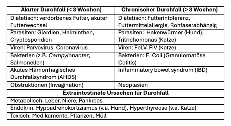 Durchfall ist ein häufiger Vorstellungsgrund bei Hund und Katze in der tierärztlichen Praxis. Die Ursachen sind vielfältig und reichen von extraintestinalen Faktoren über infektiöse, parasitäre und entzündliche Darmerkrankungen bis hin zu neoplastischen Prozessen. Eine ausführliche Anamnese (vor allem Differenzierung akuter oder chronischer Durchfall - siehe Tabelle 1) ist neben einer klinischen Untersuchung der erste Schritt, um eine Eingrenzung der Differentialdiagnosen vorzunehmen. Laboruntersuchungen helfen, die Ätiologie zu klären, den Schweregrad zu beurteilen und die Therapie zu steuern.