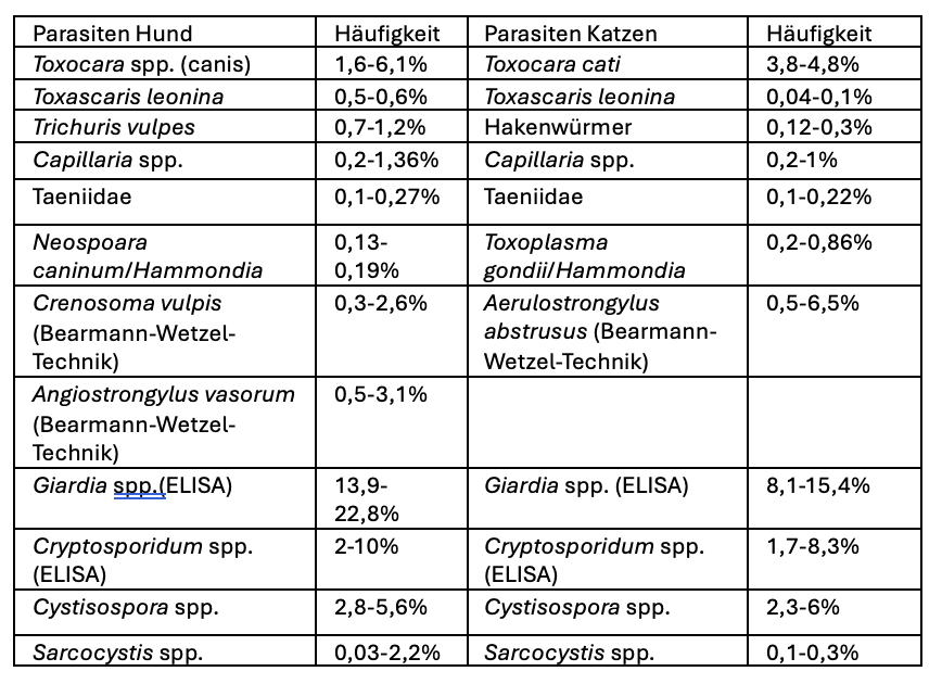 Die Untersuchung von Kotproben auf Parasiten ist vor allem bei jungen Hunden und Katzen (< 1 Jahr) und Fällen einer akuten Diarrhoe unerlässlich. Eine Infektion mit Endoparasiten bei Hunden und Katzen in Deutschland ist über alle Altersklassen häufig (30,4 % und 22,8 %), wobei das Infektionsrisiko bei Welpen (< 6 Monaten) am höchsten ist. Ob eine Infektion mit Endoparasiten zu einer klinischen Symptomatik führt, hängt von diversen Faktoren (Alter des Tieres, Immunstatus, Erregerlast etc.) ab. Wird ein Wurmbefall nachgewiesen, sollte eine Entwurmung mit einem geeigneten Anthelminthikum erfolgen.