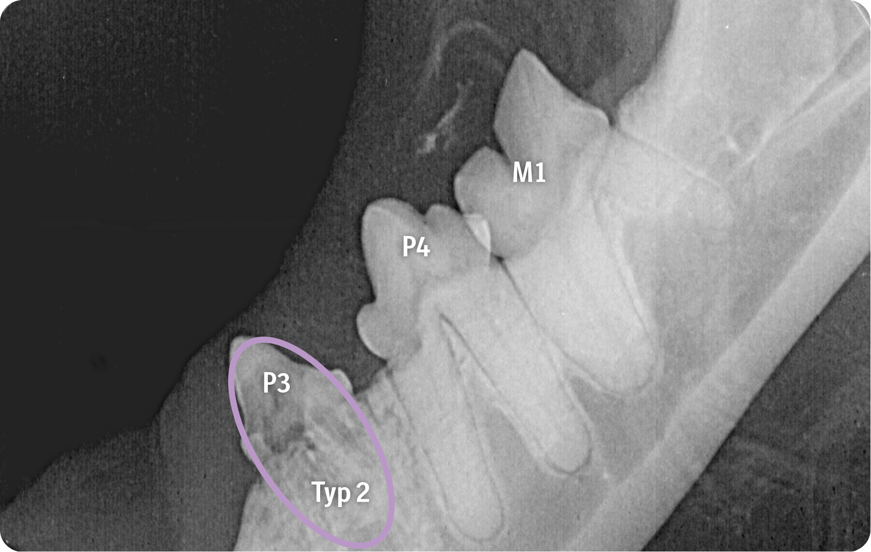 Über entsprechende Röntgenbefunde kann die Zahnresorption aufgezeigt werden. Durch die Visualisierung des Kalenders haben Tierärzt:innen ein gutes Medium, um zu erreichen, dass ihre Botschaft von Tierhalter:innen nicht nur gehört, sondern auch verstanden wird. Wichtig dabei ist die Unterscheidung der einzelnen Typen der Erkrankung. Die intraorale Aufnahme des Unterkiefers rechts zeigt eine Zahnresorption Typ 1 bei M1 mit fokaler Zahnresorption im Kronenbereich sowie den Übergang zur Wurzel bei erhaltenem Parodontalspalt. Bei P3 und P4 werden durch die Aufnahme fehlende Kronenbereiche mit nur noch schwach nachvollziehbaren resorbierten und in Knochengewebe umgebauten Wurzeln erkennbar sowie der Verlust des Parodontolspalts, also eine Zahnresorption vom Typ 2.