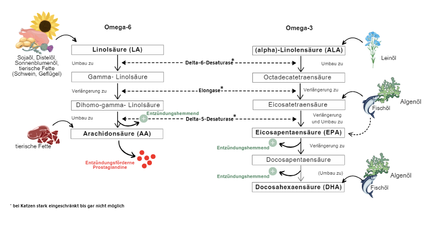 Basierend auf den bisherigen Erkenntnissen gibt es keine einheitliche Empfehlung für das optimale Omega-6/Omega-3-Verhältnis für Haustiere. Für Hunde und Katzen wird nach neueren Forschungserkenntnissen aber ein Verhältnis von unter 10:1 als erstrebenswert angesehen, sofern die Versorgung mit LA sichergestellt ist [22]. Ein entscheidender Faktor ist, dass Omega-6 und Omega-3-Fettsäuren um dieselben Enzyme konkurrieren, die für ihre Umwandlung in bioaktive Metaboliten benötigt werden. Da Omega-6-Fettsäuren bevorzugt von diesen Enzymen in AA umgewandelt werden, kann eine übermäßige Zufuhr nicht nur entzündungsfördernde Prozesse verstärken, sondern auch die enzymatische Umwandlung von ALA in EPA und DHA hemmen [7, 23]. Mit Ausnahme von fleischfressenden Säugetieren wie Katzen, die nur eine Enzymaktivität besitzen, beeinflussen demnach sowohl die relative als auch die absolute Menge an ALA und LA direkt die Umwandlungsrate in EPA, DHA und AA, wie in in-vitro-Studien gezeigt wurde [7, 8].