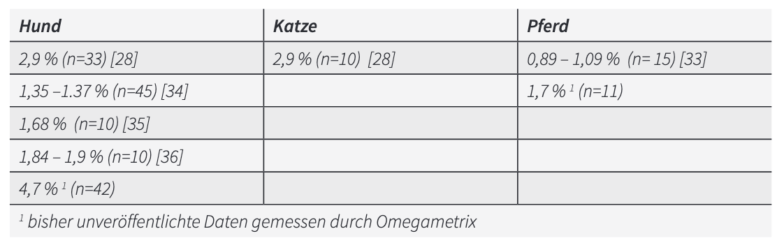 Beim Menschen wird ein Omega-3-Index von ≥ 8 % als optimal für einen präventiven Schutz angesehen, wohingegend Werte unter 4 % mit einem erhöhten Krankheitsrisiko assoziiert sind [29]. Obwohl die optimalen Schwellenwerte für Haustiere noch nicht eindeutig definiert sind, liefert der Vergleich mit dem menschlichen Omega-3-Index wertvolle Hinweise darauf, dass auch bei Hunden, Katzen und Pferden ein niedriger EPA- und DHA-Spiegel ein potenzielles Gesundheitsrisiko darstellen könnte. Bisherige Untersuchungen zum Omega-3-Index in Hunden, Katzen und Pferden zeigen zwar eine hohe Variabilität innerhalb der Spezies [41], belegen jedoch gleichzeitig, dass der Anteil an EPA und DHA in den meisten Tieren niedrig ist und häufig weit unter dem angestrebten 8 %-Wert im Menschen liegt (siehe Tabelle 2).