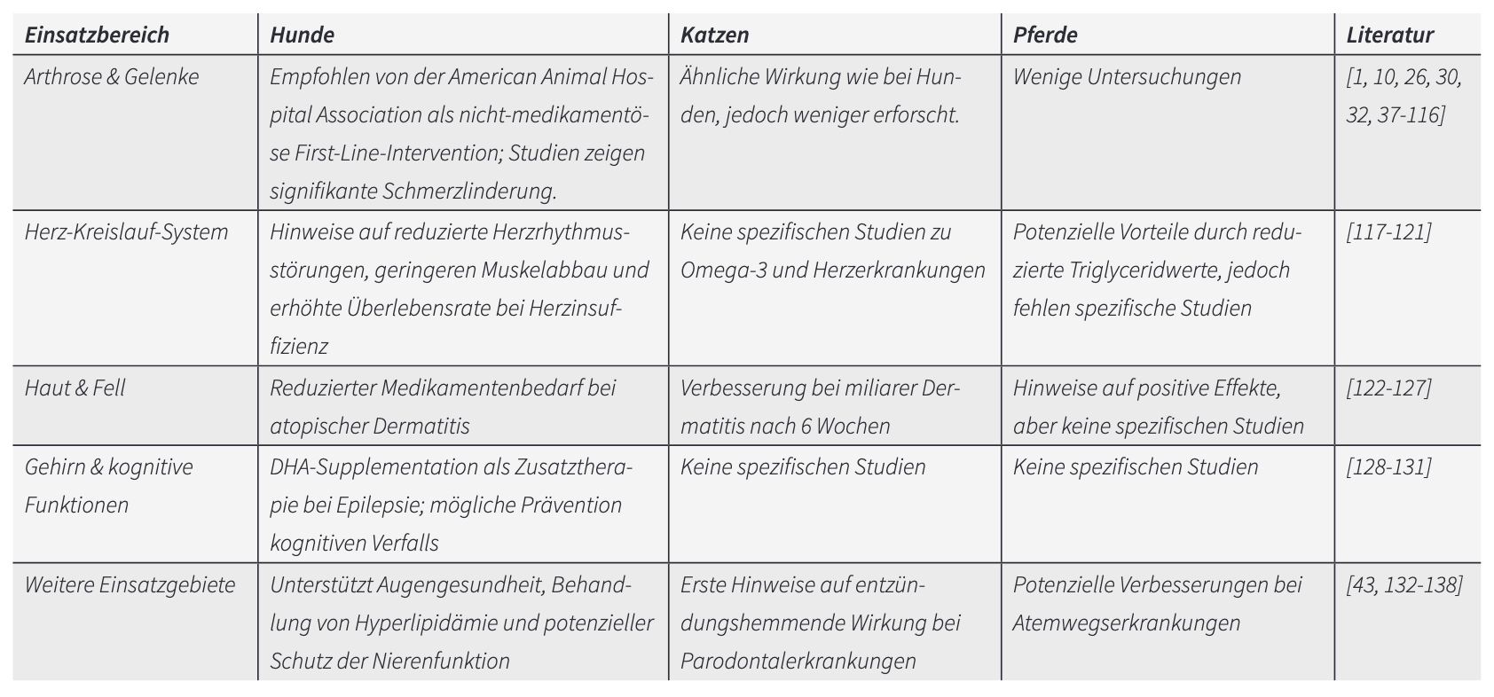 Omega-3-Fettsäuren sind für viele physiologische Prozesse unverzichtbar. Angesichts der modernen Ernährungsbedingungen ist eine Supplementierung oft sinnvoll, um ein gesundes Omega-6-zu-Omega-3-Verhältnis zu erreichen. Wissenschaftliche Studien zeigen, dass Tiere mit entzündlichen Erkrankungen, Herz-Kreislauf-Problemen oder Hautproblemen besonders profitieren können. Weitere Forschung ist notwendig, um das Potenzial, sowie Sicherheit und Nebenwirkungen weiter zu beleuchten.