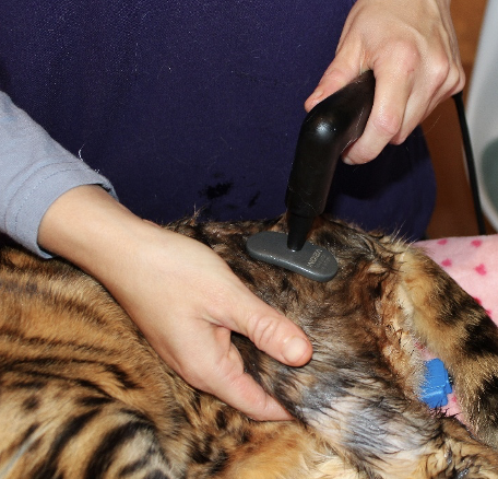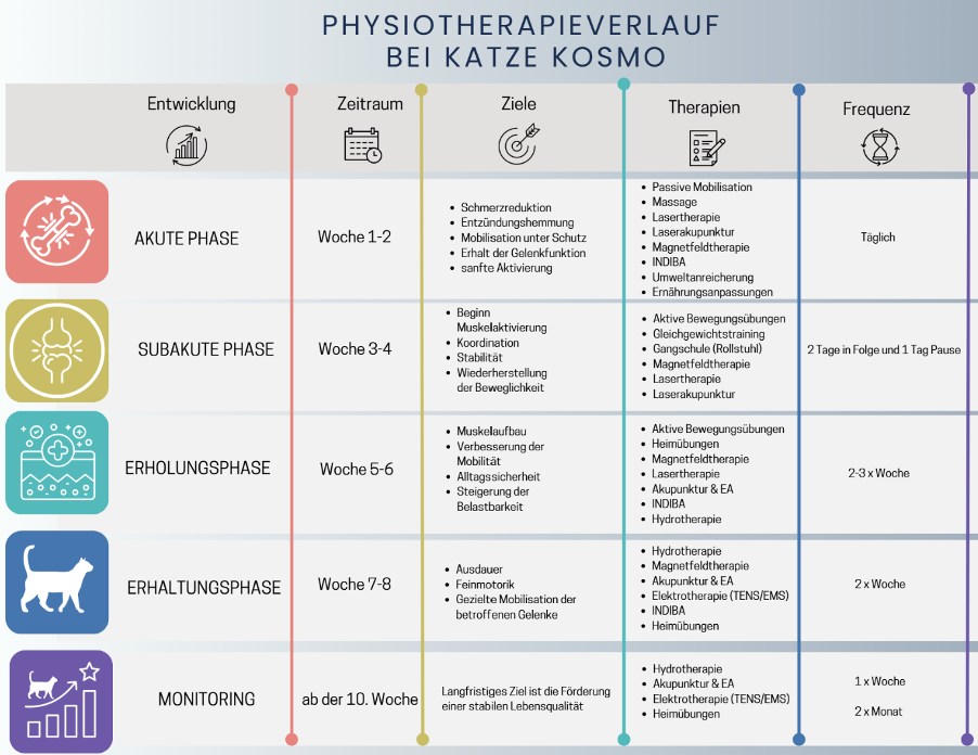 Die physiotherapeutische Behandlung wurde am fünften postoperativen Tag unter fortlaufender Analgesie eingeleitet. Die Verlaufskontrolle erfolgte bei jedem Termin mittels modifizierter Feline Grimace Scale sowie durch die Beobachtungen der Besitzerin im häuslichen Umfeld. Für den etwa achtwöchigen Rehabilitationszeitraum wurden folgende Ziele definiert: Reduktion nozizeptiver und entzündlicher Prozesse, Verbesserung der Gelenkfunktion, Muskelaufbau, Förderung von Gleichgewicht, Koordination und posturaler Kontrolle sowie Stabilisierung des emotionalen Wohlbefindens.